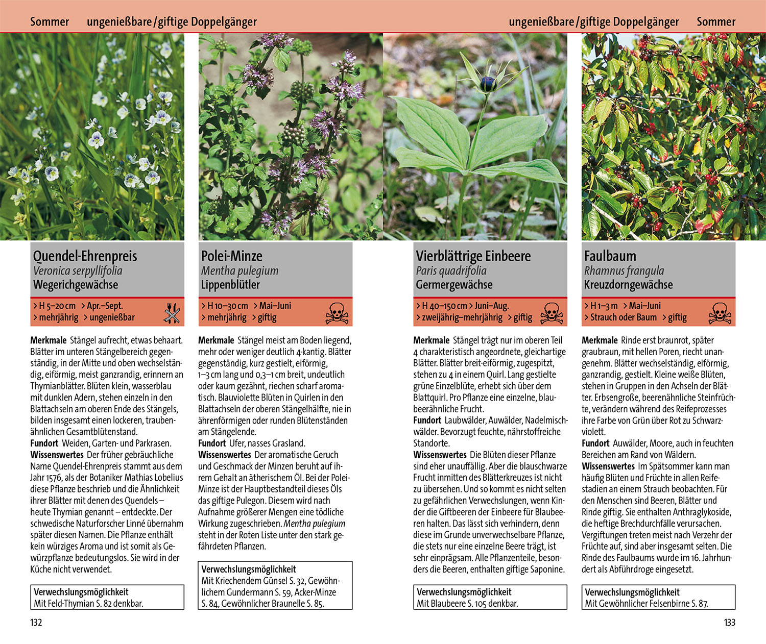 Damit auch Einsteiger gefahrlos Pflanzen und Früchte in der Natur sammeln können, bietet dieser Pflanzenführer einen besonderen Service: Den essbaren Pflanzen werden ihre ungenießbaren oder gar giftigen Doppelgänger gegenübergestellt. Dieses Konzept sowie die einfache Gliederung nach Jahreszeiten und die eindeutigen Abbildungen sorgen für ein leichtes Identifizieren und sicheres Bestimmen der Pflanzen.