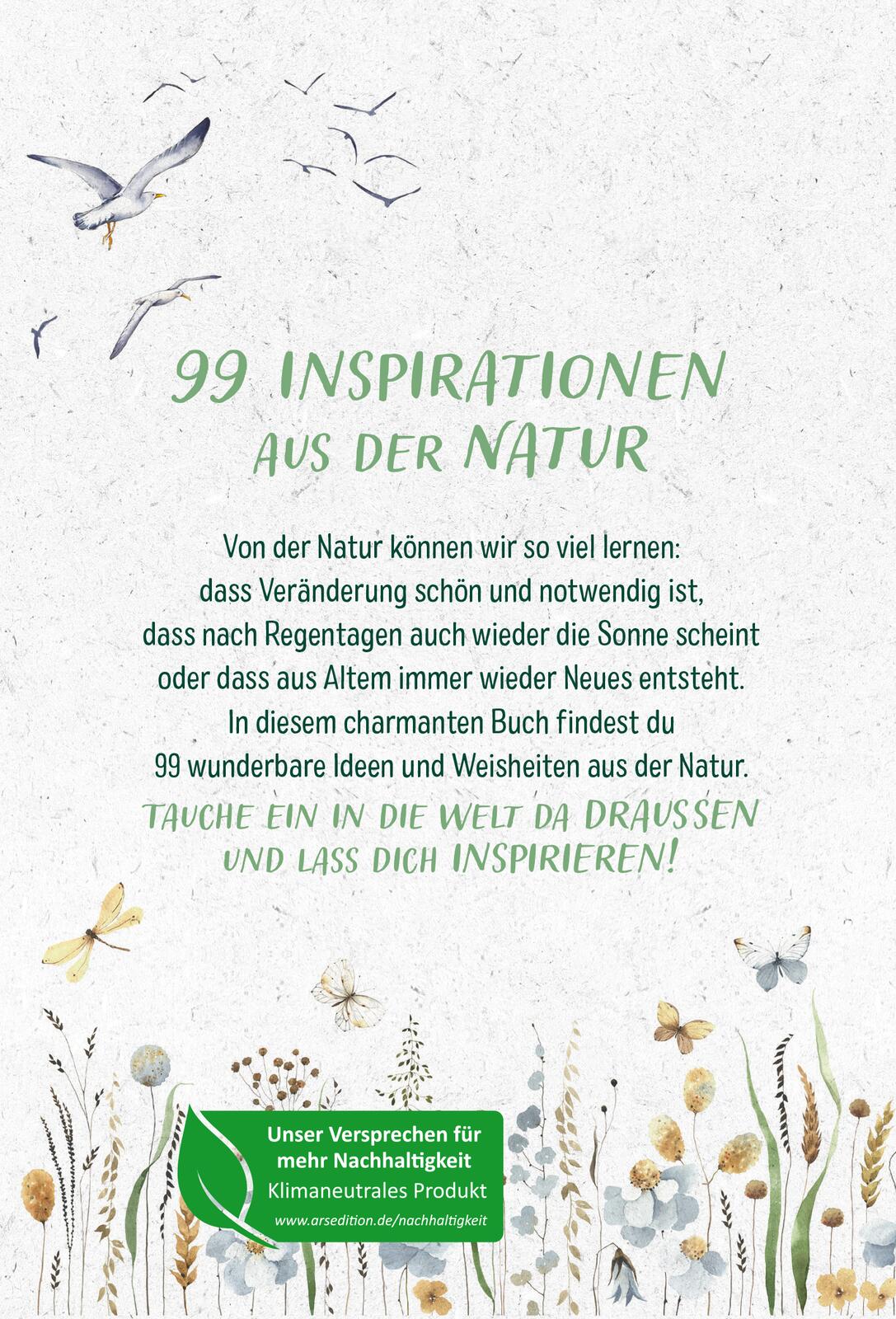 Von der Natur können wir viel lernen: dass Veränderung schön und notwendig ist, dass nach Regentagen auch wieder die Sonne scheint und dass aus Altem immer wieder Neues entsteht. In diesem charmanten Buch findest du 99 wunderbare Inspirationen und Weisheiten aus der Natur. Auf jeder Seite wartet eine kleine Anregung für ein achtsames und geerdetes Leben auf dich, untermalt von wunderschönen Fotos und Illustrationen. Tauche ein in die Natur und lass dich inspirieren: Für mehr Nachhaltigkeit und mehr Wertschätzung der Umwelt gegenüber.