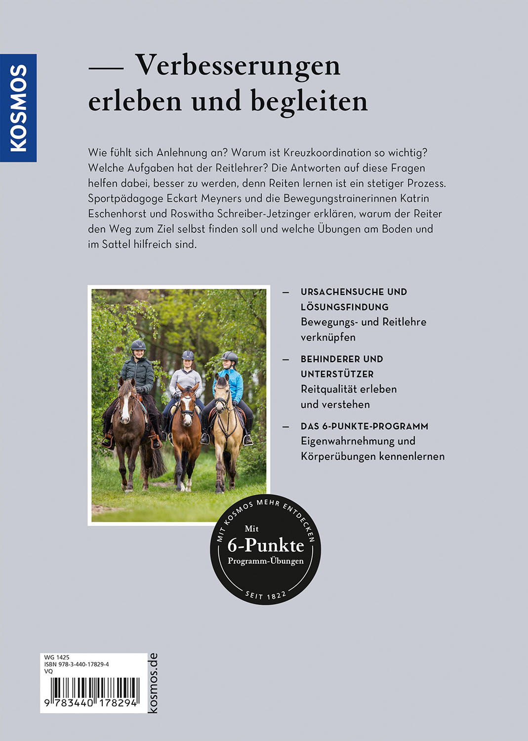 Sportpädagoge Eckart Meyners und seine Kolleginnen Katrin Eschenhorst und Rosi Schreiber-Jetzinger zeigen in diesem Buch eine moderne Lernmethodik, um das Reiten zu verbessern. Ihre gezielte Fehleranalyse sowie Übungen für konkrete Situationen helfen im Alltag.