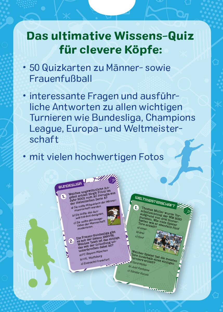 In dieser Quizbox für fußballbegeisterte Kinder ab 8 Jahren gibt es viele knifflige Fragen zu verschiedenen Themen wie Teams, Spieler, Trainer, Tore, legendäre Spiele und vieles mehr. Alle Antworten und viele weitere interessante Informationen befinden sich auf den jeweiligen Kartenrückseiten.