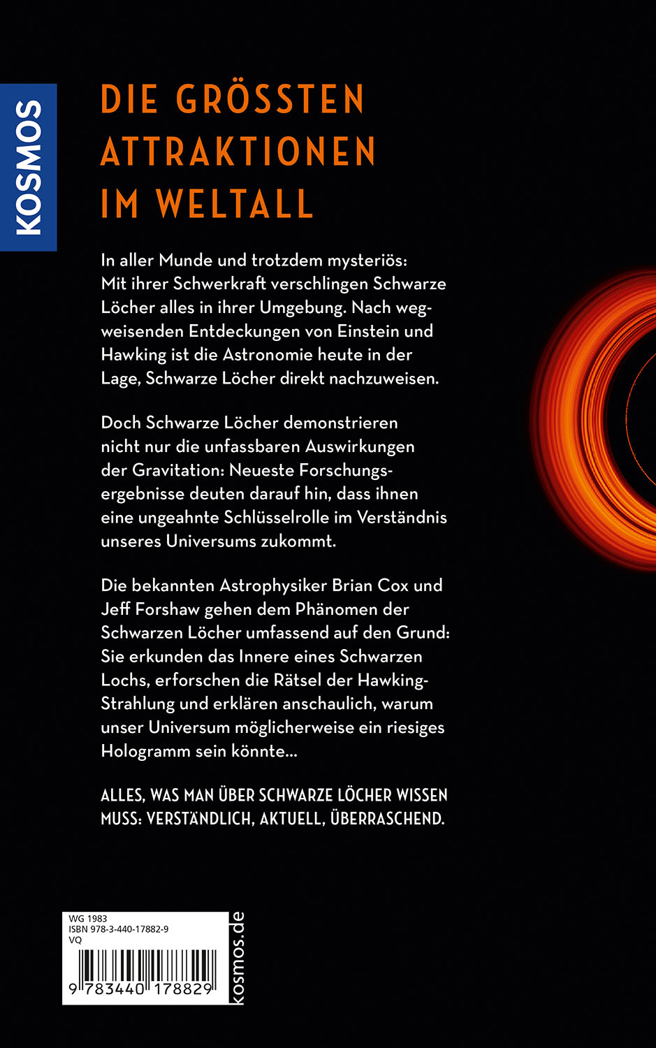 Das renommierte Autorenduo Brian Cox und Jeff Forshaw (bereits bei KOSMOS erschienen: "Warum ist E = mc2?", "Mensch und Universum", "Was wiegt das Universum?") erklären gewohnt unaufgeregt, leicht verständlich und wissenschaftlich fundiert, was hinter Schwarzen Löchern steckt und wie sie uns dabei helfen könnten, unseren Platz im Universum zu finden.
