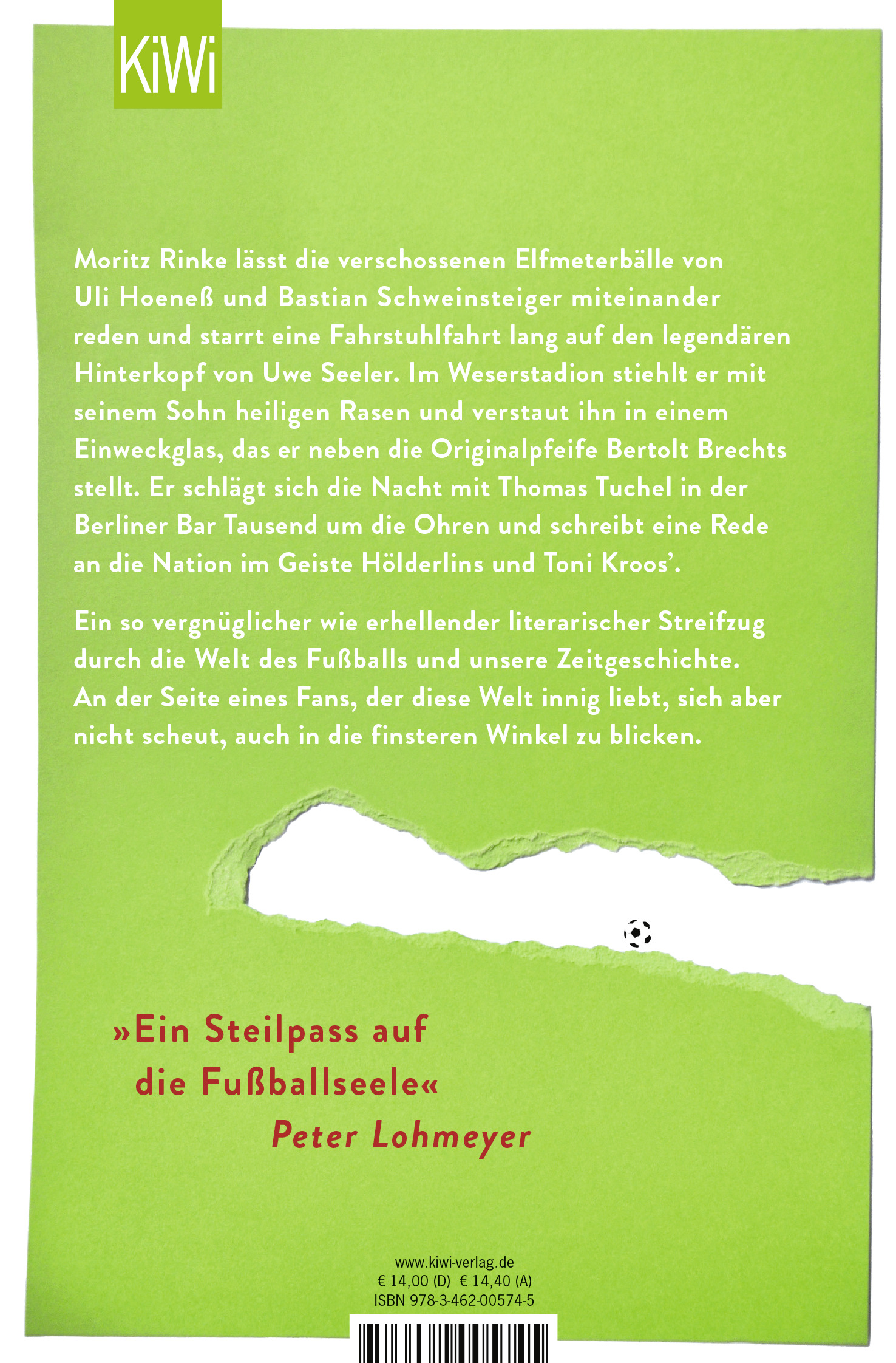 Moritz Rinke lässt die verschossenen Elfmeterbälle von Uli Hoeneß und Bastian Schweinsteiger miteinander reden und starrt eine Fahrstuhlfahrt lang auf den legendären Hinterkopf von Uwe Seeler. Im Weserstadion stiehlt er mit seinem Sohn heiligen Rasen und verstaut ihn in einer Tupperdose, die er neben die Originalpfeife Bertolt Brechts stellt. Er schlägt sich die Nacht mit Thomas Tuchel in der Berliner Tausendbar um die Ohren und schreibt eine Rede an die Nation im Geiste Hölderlins und Toni Kroos'. In Katar besichtigt er ungläubig die neu errichteten Stadien und erzählt am Beispiel seiner Nichte und deren Freundin, die ein Verhältnis mit Neymar hatte, vom Niedergang des Fußballs.