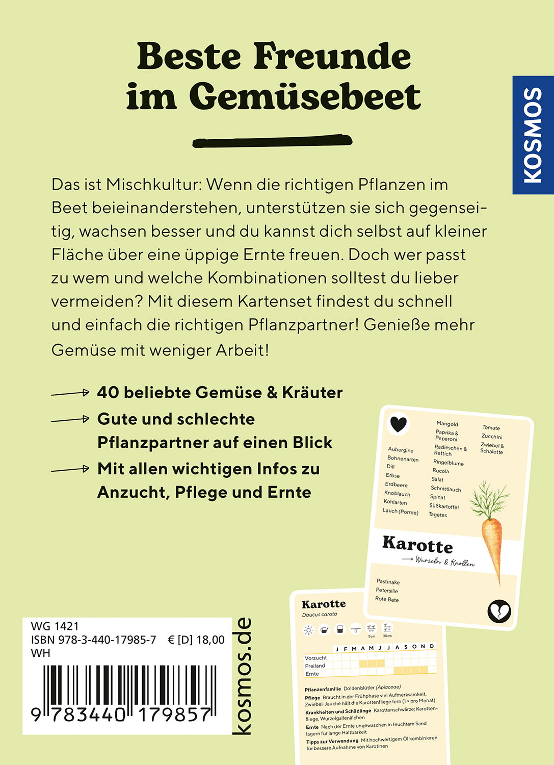 Dieses einmalige Kartenset zeigt auf 40 stabilen Karten je eine beliebte Gemüse-, Obst- oder Kräutersorte, listet passende und unpassende Pflanzpartner auf und liefert alles Wissenswerte rund um die jeweilige Pflanze.