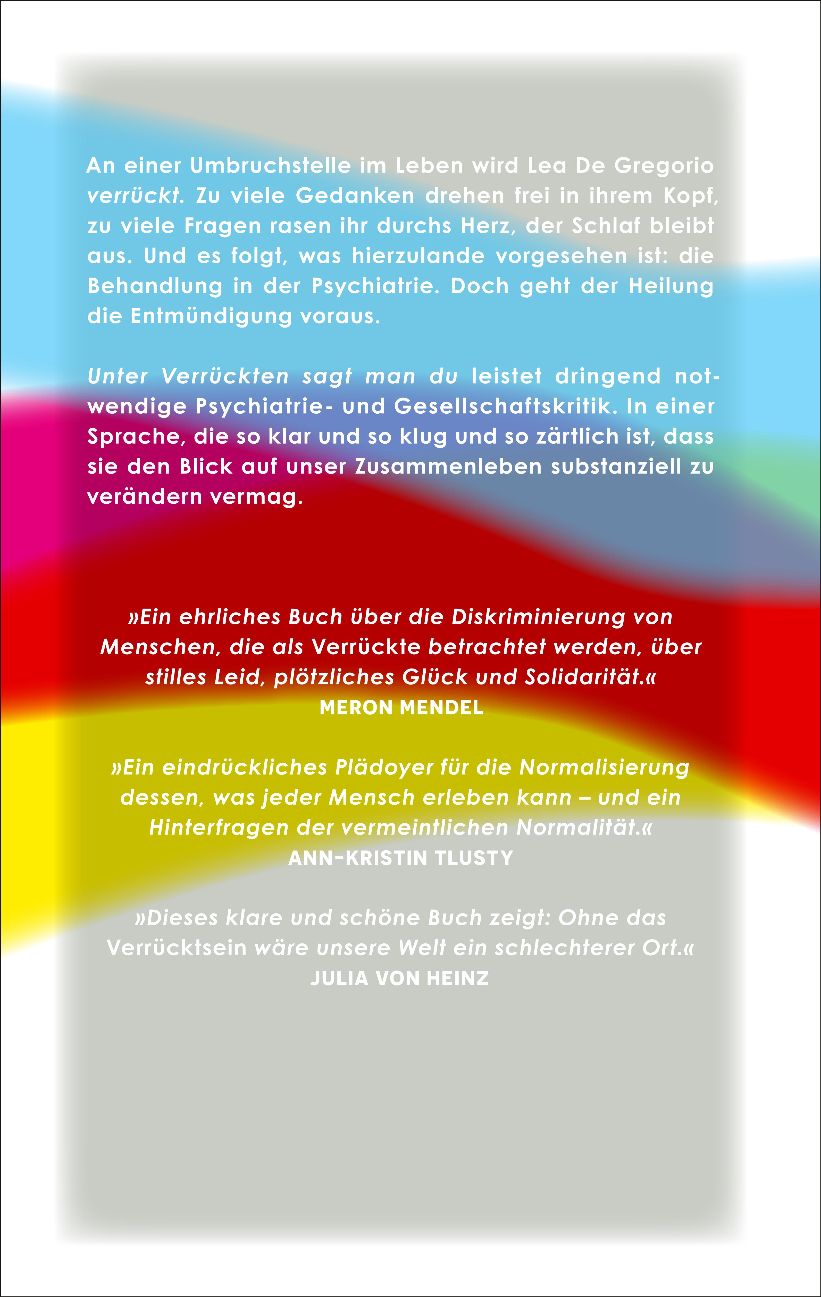 Lea De Gregorio entlarvt die tradierten Ungerechtigkeiten in unserem Denken, Fühlen, Handeln. Unter Verrückten sagt man du leistet dringend notwendige Psychiatrie- und Gesellschaftskritik. In einer Sprache, die so klar und so klug und so zärtlich ist, dass sie den Blick auf unser Zusammenleben substanziell zu verändern vermag.