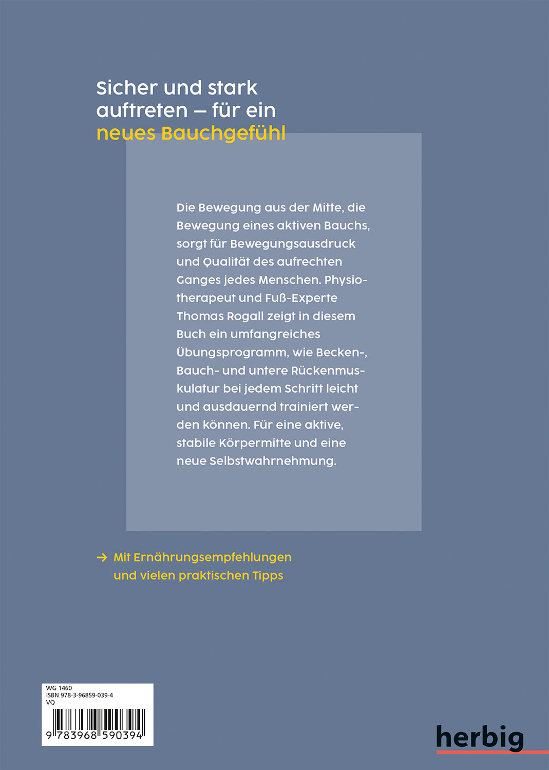 Die Bewegung aus der Mitte, die Bewegung eines aktiven Bauchs, sorgt für Bewegungsausdruck und Qualität des aufrechten Ganges jedes Menschen. Physiotherapeut und Fuß-Experte Thomas Rogall zeigt in diesem Buch umfangreiche Übungen, wie Becken- und Bauchmuskulatur bei jedem Schritt leicht und ausdauernd trainiert werden können. Für eine aktive Körpermitte und gesunde Gelenke.