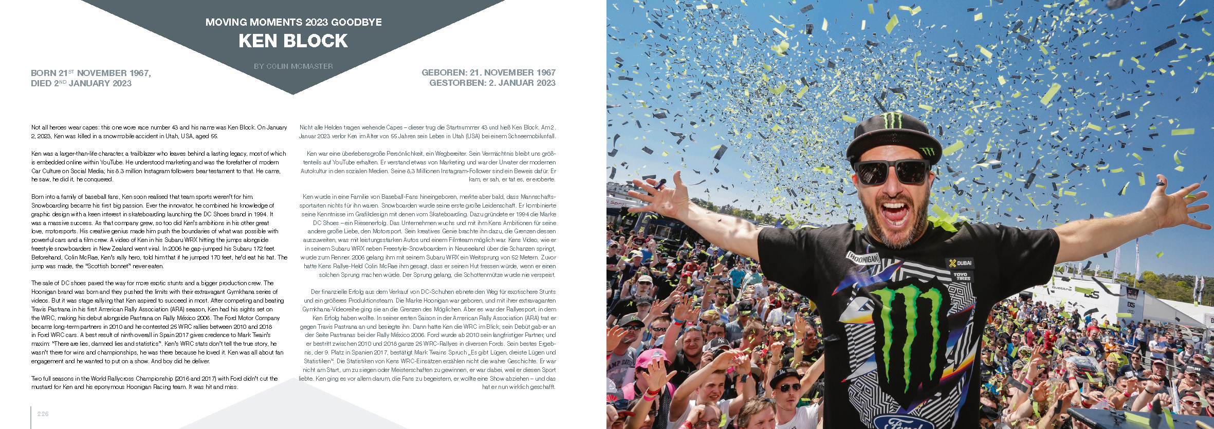 Was war los im Rallyesport 2023? 13 Runden in der Weltmeisterschaft auf vier Kontinenten im zweiten Jahr der Rally1-Hybriden, dazu Europa- und Deutsche Meisterschaft. Die jüngste Ausgabe des ultimativen Rallye-Jahrbuchs bringt wieder Rallye-Berichterstattung vom Feinsten mit Ergebnissen, Hintergrundberichten und Insider-Stories."Rallying 2023 - Moving Moments" von McKlein Publishing führt durch die ebenso spannende wie dramatische jüngste Rally-Saison. Im Mittelpunkt stehen die Berichte über die Königsklasse, in der mit der Rallye Zentraleuropa erstmals ein Lauf durch gleich drei Länder stattfand - Tschechien, Österreich und Deutschland. Nach der Covid-Pause waren 2023 auch wieder Mexiko und Chile mit dabei. Überschattet wurde die Saison vom Tod Craig Breens, dem ein Nachruf gewidmet ist. Bereits gleich zu Anfang des Jahres haben wir mit Ken Block einen veritablen Weltstar verloren, an den wir ebenfalls erinnern.Ins neue Jahrbuch gehören selbstverständlich auch wieder die Berichte über WRC2, Junior WRC und WRC Masters Cup. Schließlich darf auch das Eifel Rallye Festival nicht fehlen, das mit den Klassikern des Sports erneut riesige Mengen von Fans in die Vulkaneifel lockte. Auf 240 Seiten sehen Sie die spektakulärsten Bilder der McKlein-Fotografen, begleitet von der kompetenten Berichterstattung des Teams von Dirtfish Media - eine bewährte und erstklassige Kombination.////////////////////How did events unfold in rallying in 2023? Thirteen rounds in the World Championship over four continents in the second year of Rally1 Hybrids, plus the European and German Championships. The latest edition of the ultimate rally yearbook again combines the best images with background reports, insider stories and results."Rallying 2023 - Moving Moments" by McKlein Publishing takes you through the most recent rally season, which was as exciting as it was dramatic. The focus is on the reports about the top Rally1 class, in which for the first time a run through no less than three countries (Czech Republic, Austria and Germany) took place with the new Central European Rally. The Americas featured too, with Mexico and Chile back in the championship for 2023. The WRC season was overshadowed by the death of Craig Breen, to whom a heartfelt dedication is a must read. At the very beginning of January we lost a global megastar in Ken Block and we remember this motorsport maverick in fitting style.Of course, the new yearbook also includes reports on WRC2, Junior WRC and WRC Masters Cup. Finally, the Eifel Rally Festival, which once again attracted huge crowds of fans to the Volcanic Eifel to see the classics of the sport. Over 240 pages you will see the most spectacular pictures from the McKlein photographers, accompanied by the insightful reporting and views of the editorial team at Dirtfish Media - a proven and first-class combination.////////////////////Que s'est-il passé en rallye durant la saison 2023 ? 13 manches du Championnat du Monde se sont déroulées sur 4 continents lors de cette deuxième saison de l'ère des Rally1 Hybrid, auxquelles se rajoute le Championnat d'Europe et le Championnat d'Allemagne. La dernière édition de l'annuel de rallye vous présente une fois de plus les plus beaux reportages avec les résultats, les analyses et les coulisses.« Rallying 2023 - Moving Moments » de McKlein Publishing vous fait revivre la dernière saison de rallye qui a été à la fois passionnante et dramatique. L'accent est mis sur la catégorie reine. Pour la première fois, une épreuve, le Rallye d'Europe Centrale, a traversé trois pays : la République Tchèque, l'Autriche et l'Allemagne. Après la pause Covid, le Mexique et le Chili étaient de nouveau au rendez-vous en 2023. Mais la saison a aussi été assombrie par la mort de Craig Breen, à qui une nécrologie est dédiée. Et en tout début d'année, nous avons perdu Ken Block, une véritable star mondiale, à laquelle le livre rend également hommage.Bien entendu cet annuel revient aussi sur le WRC2, l