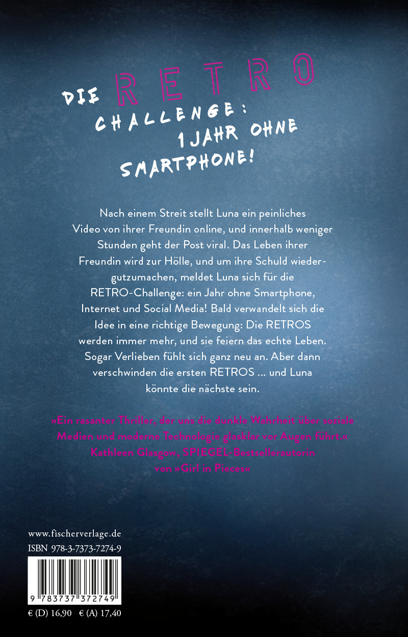 Nach einem Streit stellt Luna ein peinliches Video von ihrer Freundin online und innerhalb weniger Stunden geht der Post viral. Das Leben ihrer Freundin wird zur Hölle, und um ihre Schuld wieder gutzumachen, meldet Luna sich für die RETRO-Challenge: ein Jahr ohne Smartphone, Internet und Social Media! Bald verwandelt sich die Idee in eine richtige Bewegung: Die RETROS feiern das Leben und jeden Tag werden sie mehr, sogar Verlieben fühlt sich neu und echt an. Aber dann verschwinden die ersten RETROS ... Und Luna könnte die nächste sein.