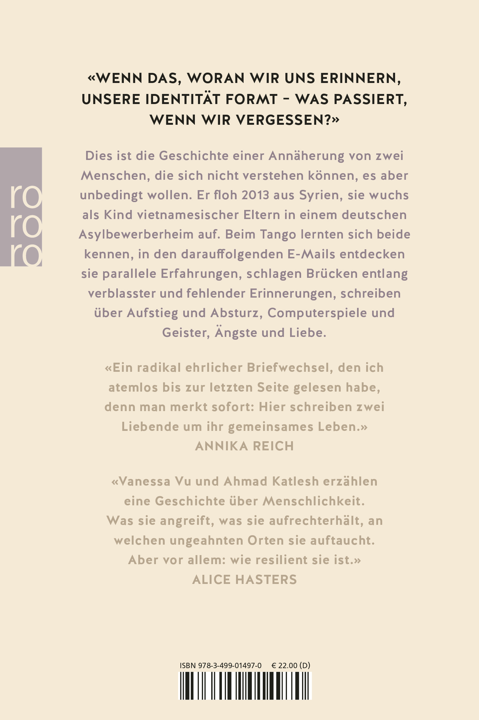 Die Lebenswege des Schriftstellers Ahmad Katlesh und der Journalistin Vanessa Vu sind geprägt, aber nicht bestimmt von Kriegen, Flucht und Migration. Katlesh floh aus Syrien und lebte mehrere Jahre in Jordanien, bevor er 2017 nach Deutschland kam. Vu ist in Deutschland geboren und lebte die ersten Jahre in einem Asylbewerberheim in Niederbayern, ihre Eltern kamen aus Vietnam. Im Tanz lernten beide sich kennen, in den darauffolgenden E-Mails näherten sie sich einander an. Sie entdecken trotz unterschiedlicher Migrationsbiografien parallele Erfahrungen, schlagen Brücken entlang verblasster und fehlender Erinnerungen, schreiben über Gefühle, Sehnsüchte und Absurditäten in unterschiedlichen Einwanderergenerationen. Mal poetisch, mal essayistisch erzählt ihr Austausch von einer Suche nach Trost und Liebe sowie von jahrelangen Kriegen mit sich selbst und in den sie umgebenden Gesellschaften.