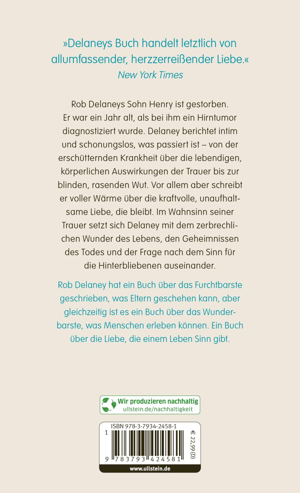 Rob Delaneys Sohn Henry ist gestorben. Er war ein Jahr alt, als bei ihm ein Hirntumor diagnostiziert wurde. Delaney berichtet intim und schonungslos, was passiert ist -- von der erschütternden Krankheit über die lebendigen, körperlichen Auswirkungen der Trauer und die blinde, rasende Wut. Vor allem aber schreibt er voller Wärme über die kraftvolle, unaufhaltsame Liebe, die bleibt. Im Wahnsinn seiner Trauer setzt sich Delaney mit dem zerbrechlichen Wunder des Lebens, den Geheimnissen des Todes und der Frage nach dem Sinn für die Hinterbliebenen auseinander.