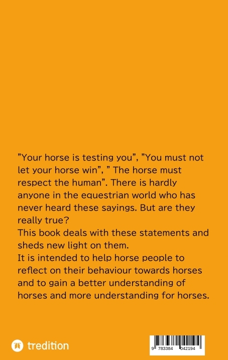 Your horse is testing you", "You can't let the horse win", "You have to be the lead animal for your horse," and many similar phrases are still on everyone's lips and minds, believed, taken to heart when dealing with horses, and passed on to others. But are they really true? What exactly is your horse testing? And what does it want to win? This book sheds light on these and other questions and encourages you to take a closer look.