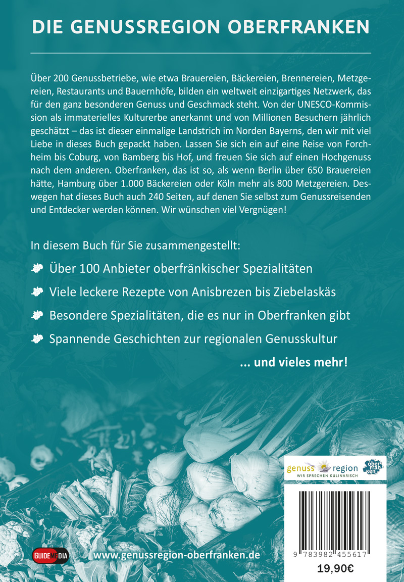 Über 200 Genussbetriebe wie etwa Brauereien, Bäckereien, Brennereien, Metzgereien, Restaurants und Bauernhöfe bilden ein weltweit einzigartiges Netzwerk, das für den ganz besonderen Genuss und Geschmack steht. Von der UNESCO-Kommission als immaterielles Kulturerbe anerkannt und von Millionen Besuchern jährlich geschätzt – das ist dieser einmalige Landstrich im Norden Bayerns, den wir mit viel Liebe in dieses Buch gepackt haben. Lassen Sie sich ein auf eine Reise von Forchheim bis Coburg, von Bamberg bis Hof und freuen Sie sich auf einen Hochgenuss nach dem anderen. Oberfranken, das ist so, als wenn Berlin über 650 Brauereien hätte, Hamburg über 1.000 Bäckereien oder Köln mehr als 800 Metzgereien. Deswegen hat dieses Buch auch 280 Seiten, auf denen Sie selbst zum Genussreisenden und Entdecker werden können. Wir wünschen viel Vergnügen!