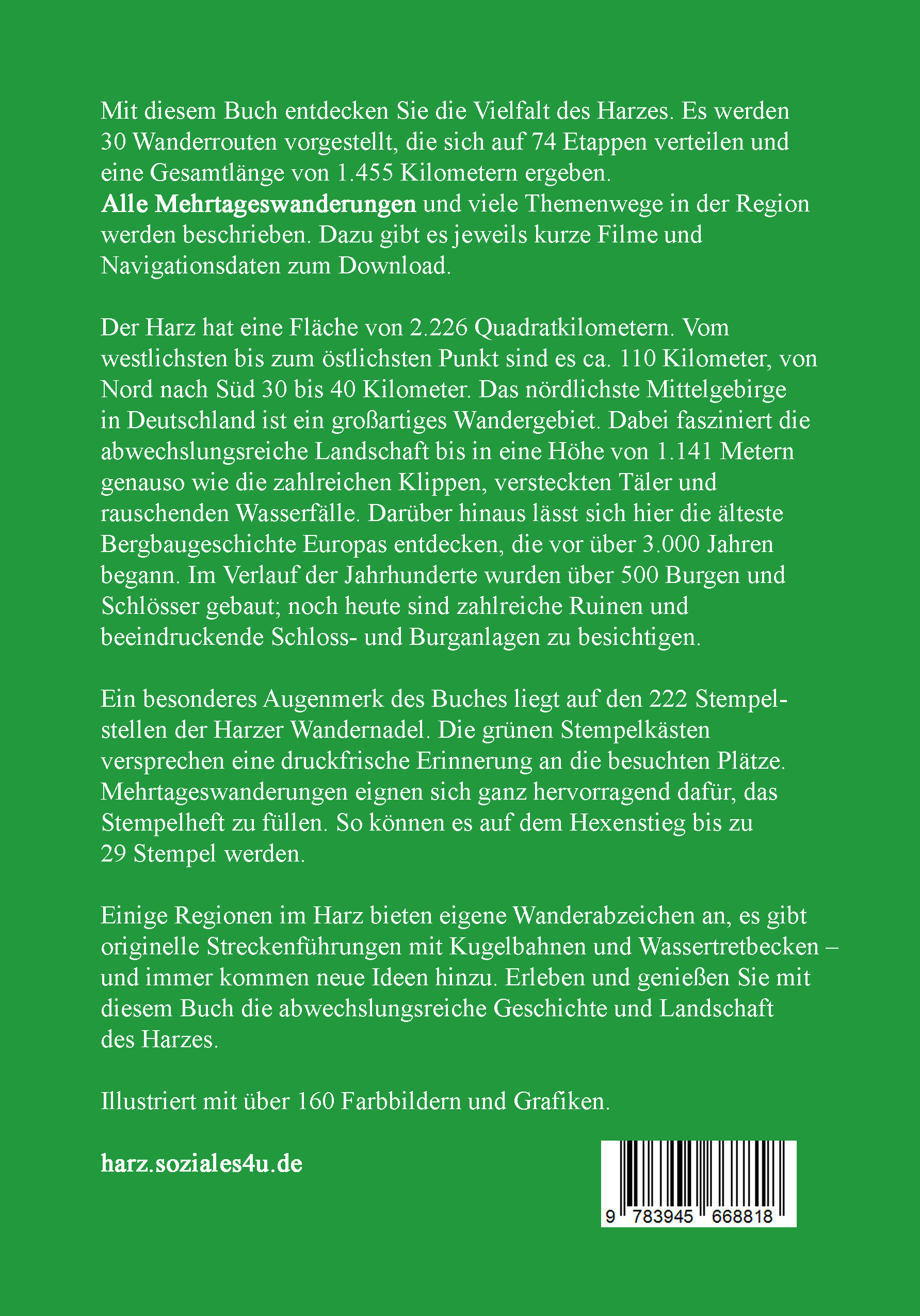 Ein besonderes Augenmerk des Buches liegt auf den 222 Stempelstellen der Harzer Wandernadel. Die grünen Stempelkästen versprechen eine druckfrische Erinnerung an die besuchten Plätze. Mehrtageswanderungen eignen sich ganz hervorragend dafür, das Stempelheft zu füllen. So können es auf dem Hexenstieg bis zu 29 Stempel werden.