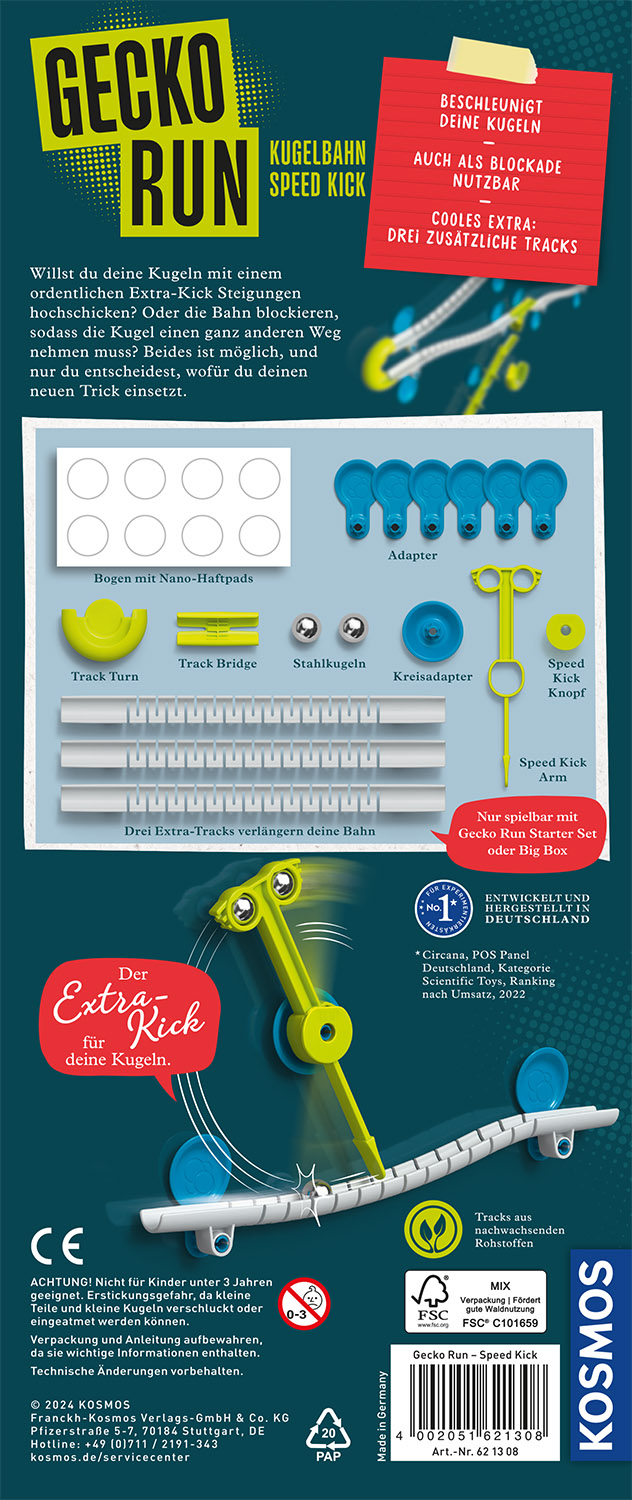 Los geht's mit Action und Tempo! Der Speed-Kick verleiht den Kugeln einen kräftigen Schub und schon sind selbst Steigungen ein Kinderspiel. Aber das ist noch nicht alles: Der Speed-Kick kann auch als trickreiches Hindernis für nachfolgende Kugeln dienen. Wer findet eine kreative Lösung, damit diese trotzdem ihr Ziel erreichen? Die vielen Zusatzteile verleihen der Bahn noch mehr Länge! Die Kurzanleitung hilft beim Durchstarten mit dem Speed-Kick – und schon kann es losgehen! Bergauf, bergab - hier wird Tempo großgeschrieben! Eine aufregende Erweiterung für das KOSMOS Gecko Run Spiel und eine spannende Herausforderung für Kinder ab acht Jahren. Hinweis: Nur mit dem KOSMOS Gecko Run „Starter Set“ oder der 'Big Box' spielbar.