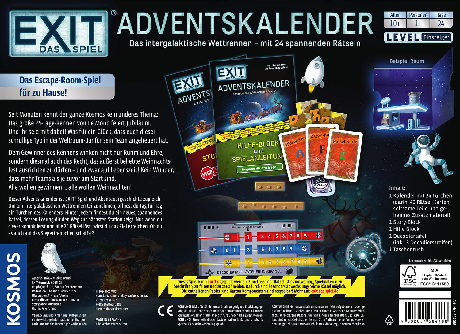 Team Weihnachtsmann braucht Hilfe! Denn ein abenteuerliches Wettrennen quer durch die Weiten des Weltalls steht an. Unterwegs warten zahlreiche knifflige Rätsel. Legt euch ins Zeug und findet die Lösungen, denn nur so könnt ihr das Rennen gewinnen! Der Adventskalender ist EXIT® – Das Spiel und Abenteuergeschichte in einem. Den Spieler oder die Spielerin ab 10 Jahren erwarten eine actiongeladene Story und 24 Rätsel. Das erste Türchen ist beschriftet – ab dann verrät erst die Lösung des jeweiligen Rätsels, wo es am nächsten Tag weitergeht. Ihr tappt im Dunkeln? Dann hilft ein Blick in den beiliegenden Block. Spannender vorweihnachtlicher Rätselspaß!