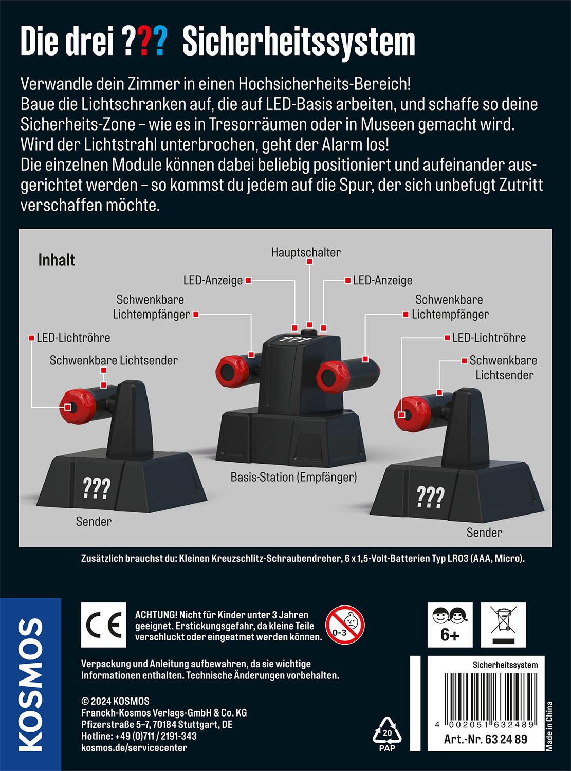 Erwischt! Nie waren Geheimnisse besser geschützt als mit dem Die drei ???-Sicherheitssystem. Durch diese Lichtschranke kommt niemand unbemerkt durch. Die ausführliche Anleitung erklärt Kindern ab acht Jahren, wie das Alarm-System richtig aufgebaut und verwendet wird: Zwei Sender strahlen die Lichtstrahlen aus. Sie werden aktiviert und auf die beiden Empfänger in der Basisstation ausgerichtet. Wenn jetzt eine Person durch die Lichtschranke geht, ertönt der Alarm. Schnell Batterien einsetzen, Tipps und Tricks lesen und das Kinderzimmer in eine Hochsicherheitszone verwandeln. Dieses Versteck ist sicher!
