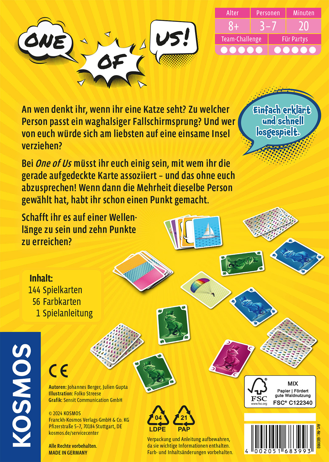 Welche Mitspielerin oder welcher Mitspieler wird von allen anderen sofort mit dem aufgedeckten Motiv auf der Karte assoziiert, wie zum Beispiel einer Katze, einem Handy oder einem Zauberer? In dem Spiel One of Us wählen drei bis sieben Spielerinnen und Spieler ab 8 Jahren eine Person aus, mit der sie das aufgedeckte Motiv am stärksten verbinden. Wenn die Mehrheit sich einig ist, erhält die Gruppe einen Punkt. Dieses kooperative Partyspiel ist in einer praktischen Box erhältlich, die man überallhin mitnehmen kann. Eine kurze Einführung ermöglicht es, sofort in lustige Gespräche und Spielrunden einzutauchen und gemeinsam unvergessliche Momente zu erleben!