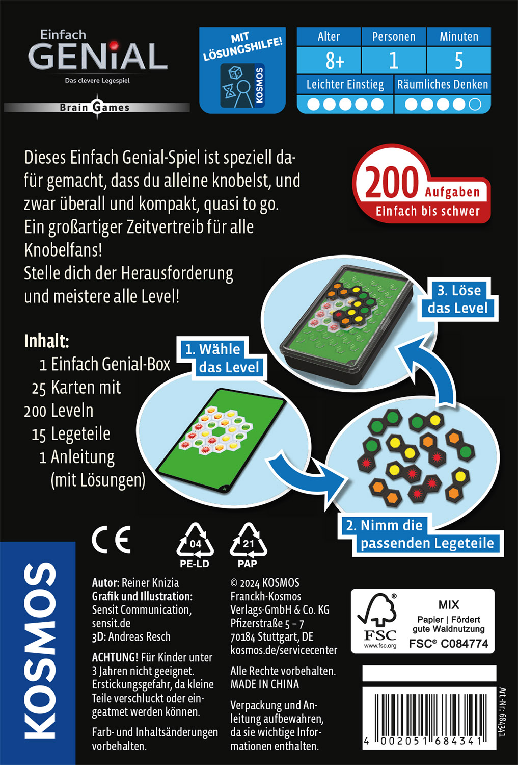 Wo kommt das nächste Legeteil hin? Liegt alles richtig? 25 Aufgabenkarten mit 200 Leveln fordern volle Konzentration. Von einfachen Einstiegs-Aufgaben bis zu absoluten Profi-Mindtwistern – Runde für Runde warten hier spannende Überraschungen und Herausforderungen. Wenn es einmal nicht weiter geht, hilft die anschauliche Anleitung oder die Lösungs-App. Ob auf dem Pausenhof, zu Hause oder unterwegs – in der handlichen Box ist das Logikspiel ab sofort immer dabei.