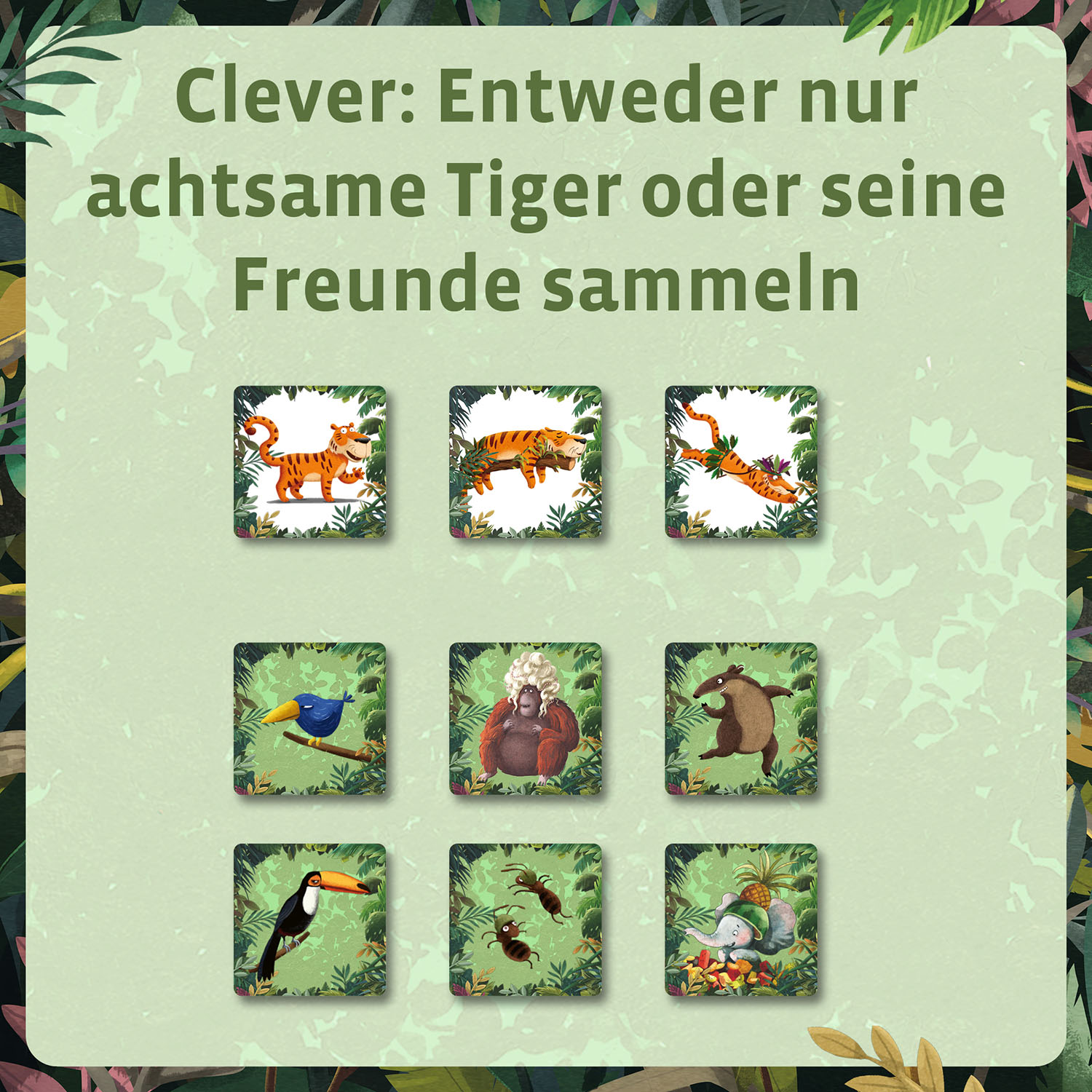 Wo steckt der achtsame Tiger? Dieses Memo-Spiel kann man auf zwei Arten gewinnen. Gesucht wird entweder der lustige Tiger, der sich unter vielen Papp-Pärchen versteckt. Oder die zwei bis fünf Kinder ab fünf Jahren sammeln verschiedene Tierfreunde. Je nachdem, wie sie sich entscheiden, wird es spannend: Decken sie nur die gesuchte Kategorie auf, dürfen sie weitermachen. Doch decken sie ein falsches Plättchen auf, endet ihr Zug. Wer merkt sich besonders viele Plättchen? Ein Kinderspiel mit dem achtsamen Tiger aus dem beliebten Bilderbuch. Abenteuer im Dschungel!
