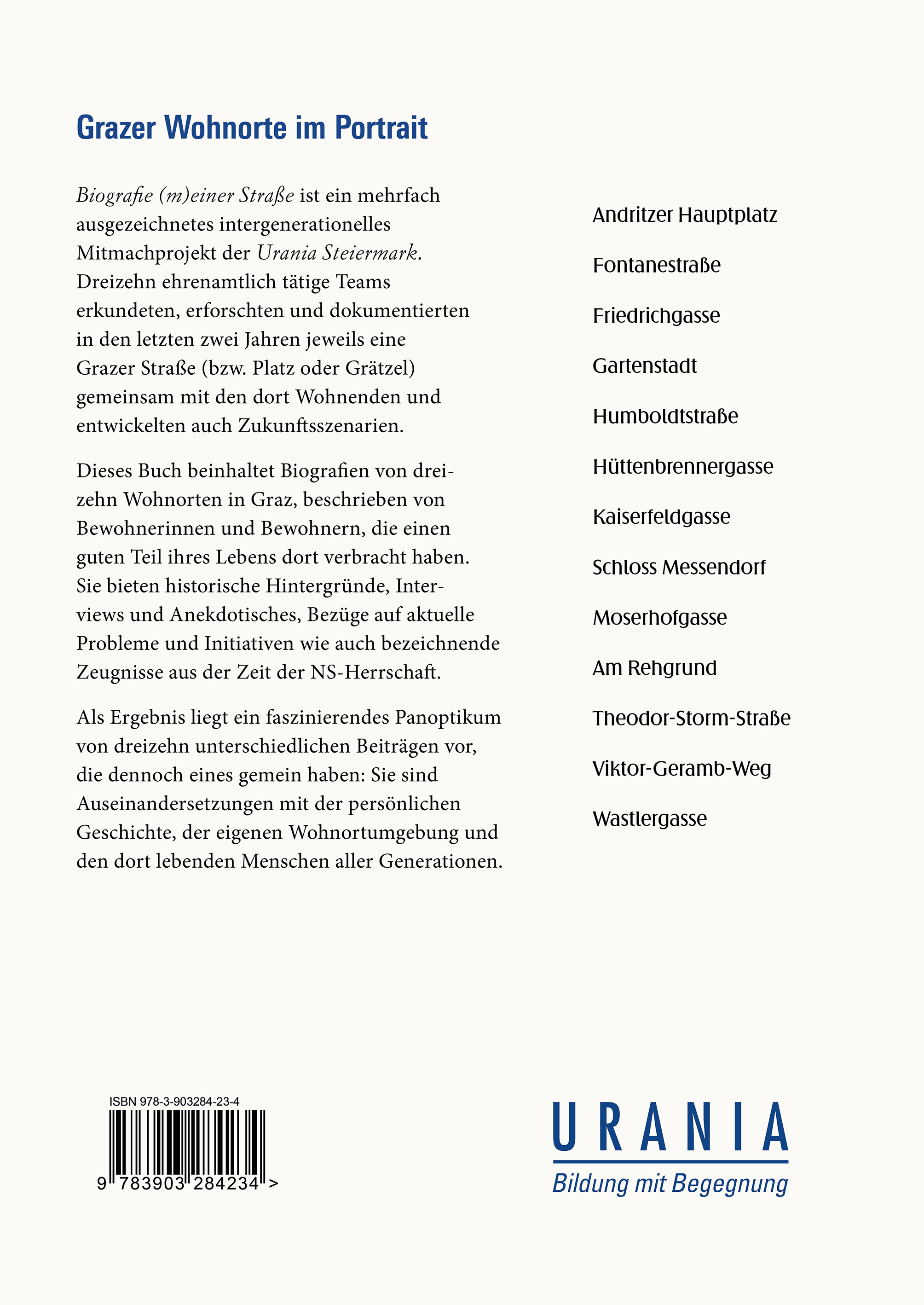 »Biografie (m)einer Straße« ist ein mehrfach ausgezeichnetes intergenerationelles Mitmachprojekt der Urania Steiermark. Dreizehn ehrenamtlich tätige Teams erkundeten, erforschten und dokumentierten in den letzten zwei Jahren jeweils eine Grazer Straße (bzw. Platz oder Grätzel) gemeinsam mit den dort Wohnenden und entwickelten auch Zukunftsszenarien.