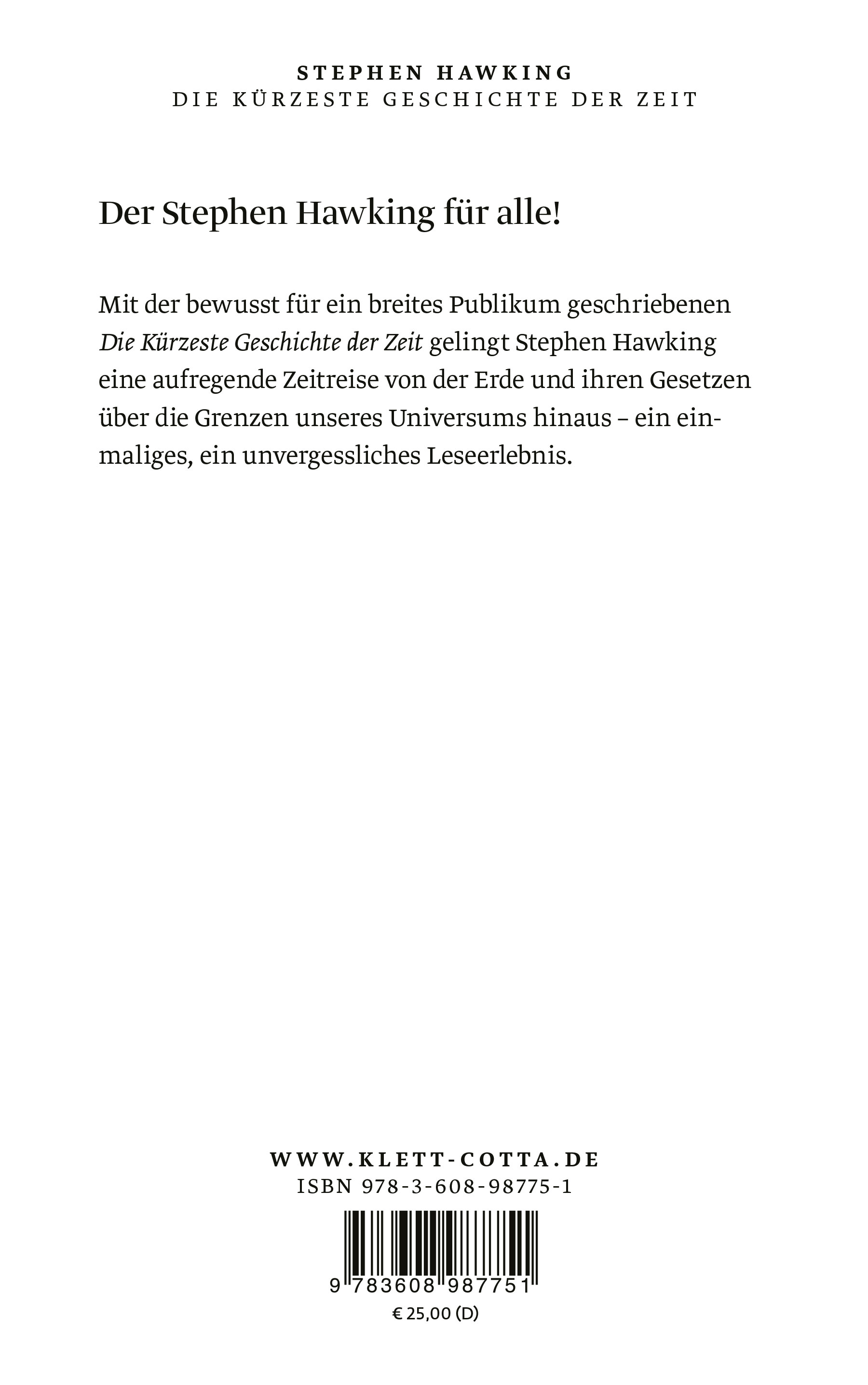 Mit der bewusst für ein noch breiteres Publikum geschriebenen Die Kürzeste Geschichte der Zeit gelingt Stephen Hawking eine aufregende Zeitreise von der Erde und ihren Gesetzen über die Grenzen unseres Universums hinaus - ein einmaliges, ein unvergessliches Leseerlebnis.