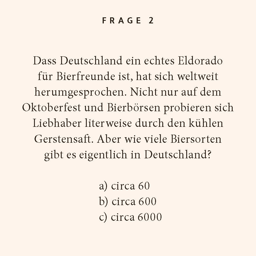 Wer jetzt noch kein kühles Bier in der Hand hält, der wird sich garantiert gleich eins wünschen! Denn hier geht es in 100 Fragen und Antworten rund um den Gerstensaft: von den Ursprüngen des Bierbrauens im alten Mesopotamien und Ägypten und klösterliche Braukunst über blutige Bierkriege bis hin zu den neuesten Craft-Beer-Trends. So wird der nächste Abend in fröhlicher Runde noch unterhaltsamer: Schließlich gilt Bier als das wohl geselligste Getränk der Menschheitsgeschichte. Prost!Stilvoll, elegant und immer eine gute Idee: Die Reihe "Quiz im Quadrat" präsentiert sich in modernem Design und sorgt für unterhaltsamen Rätselspaß - verpackt in einer edlen Geschenkbox. Perfekt als besondere 'Grußkarte' mit Mehrwert - zum Verschenken oder Selberfreuen!
