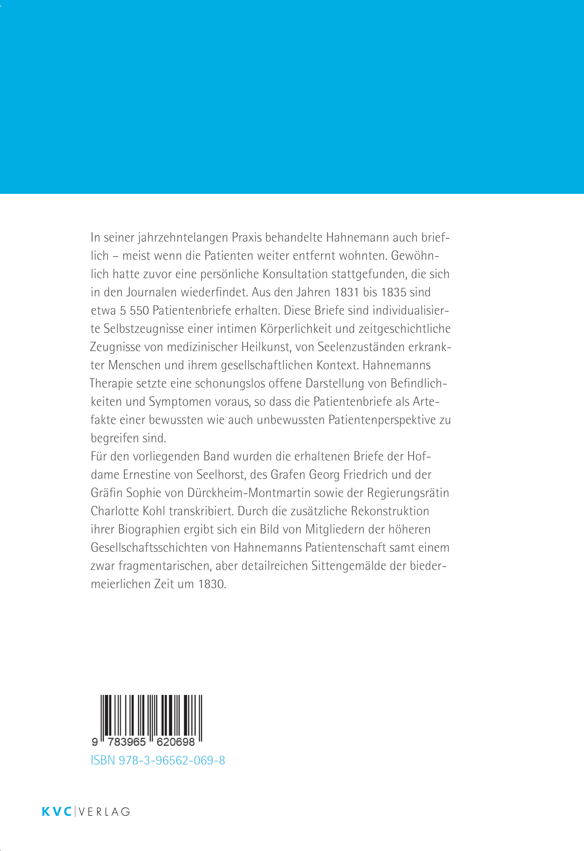 Für den vorliegenden Band von Melanie und Thilo Schlott wurden die erhaltenen Briefe der Hofdame Ernestine von Seelhorst, des Grafen Georg Friedrich und der Gräfin Sophie von Dürckheim-Montmartin sowie der Regierungsrätin Charlotte Kohl transkribiert. Durch die zusätzliche Rekonstruktion ihrer Biographien ergibt sich ein Bild von Mitgliedern der höheren Gesellschaftsschichten von Hahnemanns Patientenschaft samt einem zwar fragmentarischen, aber detailreichen Sittengemälde der biedermeierlichen Zeit um 1830.