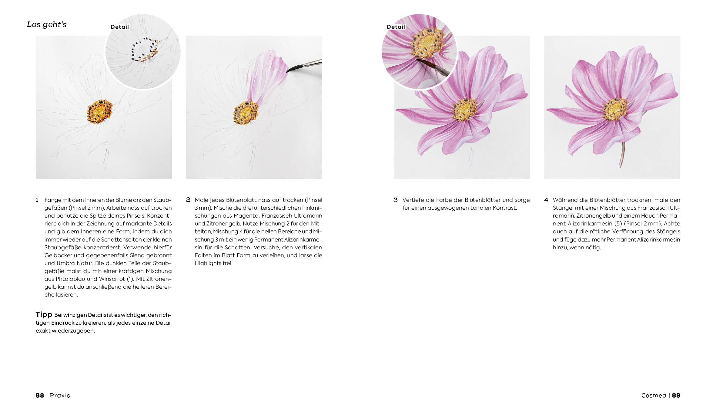 - Übersichtliche Schritt-für-Schritt-Anleitungen, mit denen die realistischen Motive einfach nachgemalt werden können