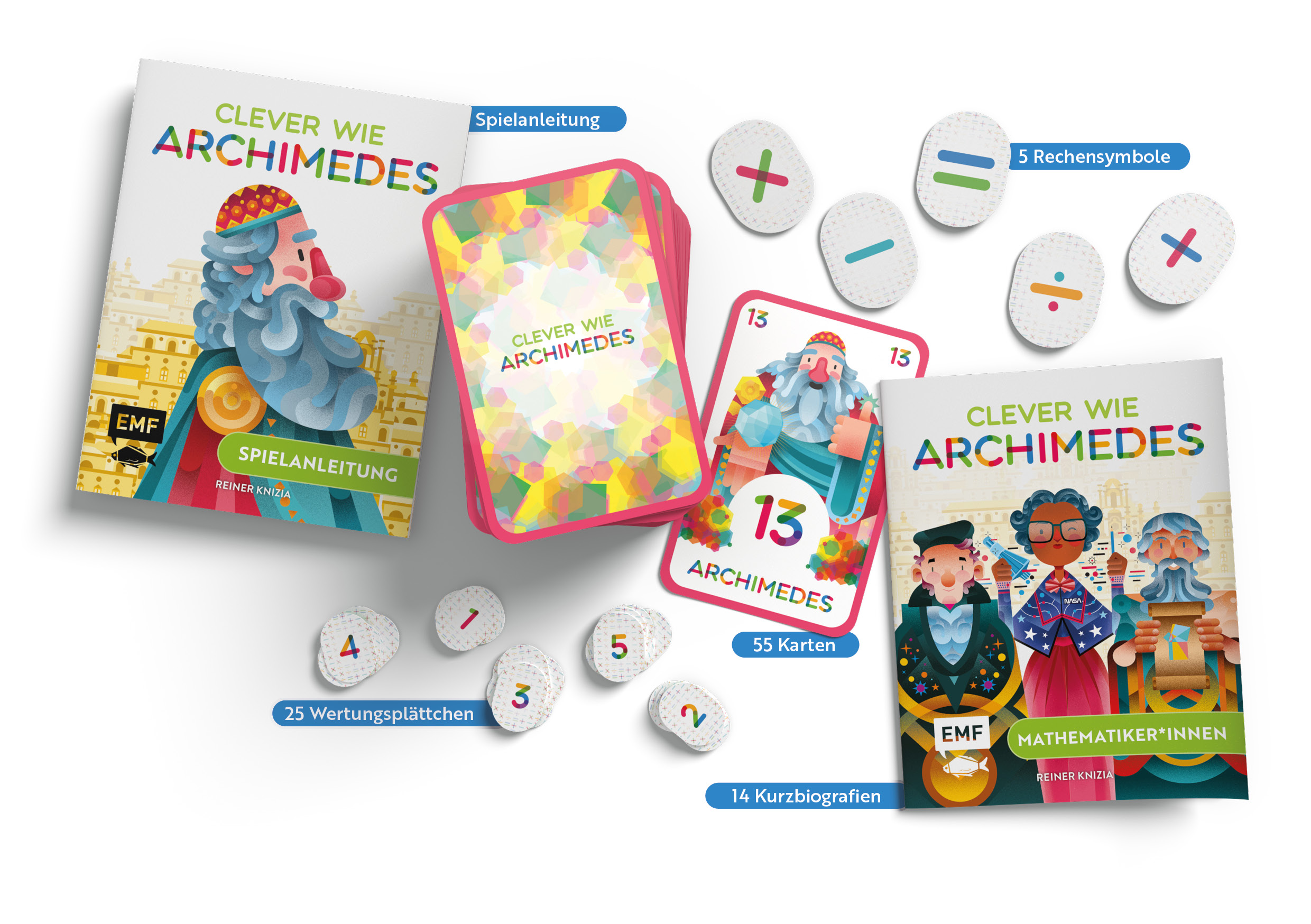 - Inhalt: Anleitung, 14 Kurzbiografien, 55 Karten, 25 Wertungsplättchen und 5 Rechensymbole