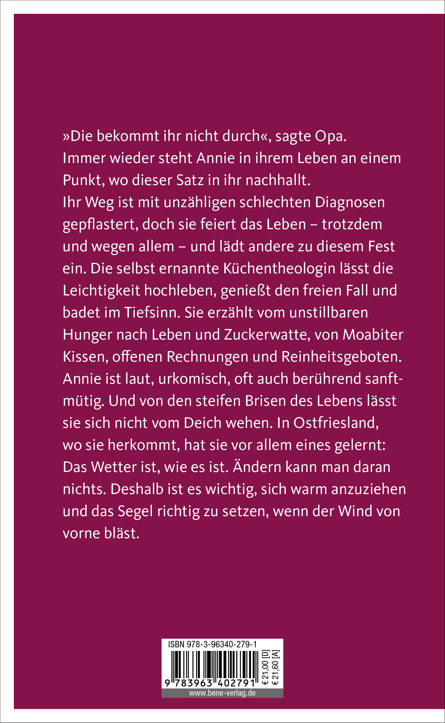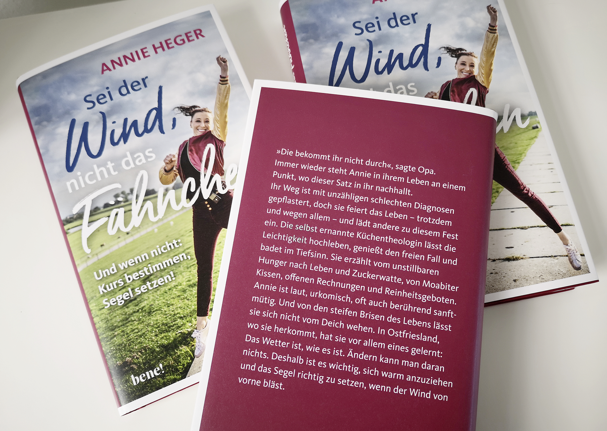 Von den steifen Brisen des Lebens lässt sich Annie Heger nicht vom Deich wehen. An der Nordsee, wo sie herkommt, hat sie vor allem eines gelernt: Das Wetter ist wie es ist. Ändern kann man daran nichts, aber sich warm anziehen. Der Friesennerz kann Regenschutz sein und die Zuversicht auf baldigen Sonnenschein hilft ein wenig, den eisigen Gegenwind zu ertragen. Auch anderen macht sie Mut, sich der persönlichen Situation zu stellen, wenn sie sagt: Sei der Wind, nicht das Fähnchen, das sich in alle Richtungen wehen lässt.
