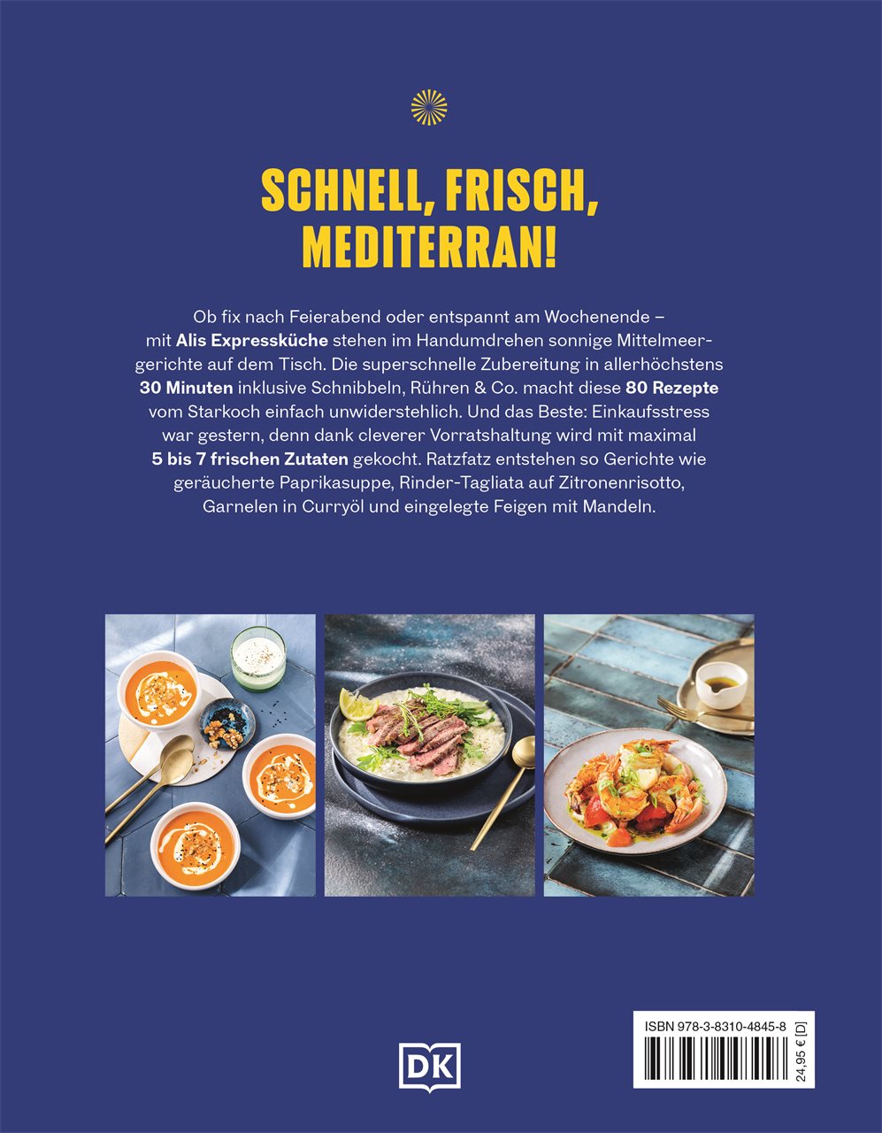 Geräucherte Paprikasuppe mit Walnüssen, Rinder-Tagliata mit Zitronenrisotto oder Aprikosen-Clafoutis mit Lavendelhonig: Spitzen- und TV-Koch Ali Güngörmüs beweist in diesem Mittelmeer-Kochbuch, dass mediterrane Küche nicht kompliziert sein muss! Von Vorspeisen und Suppen über Hauptgerichte bis Desserts: Jedes der 80 Express-Rezepte hat eine Zubereitungszeit von höchstens 30 Minuten. Und dank der durchdachten Kombination aus frischen Zutaten und Lebensmitteln, die Sie schon im Vorrat haben, ist selbst der Einkauf blitzschnell erledigt.