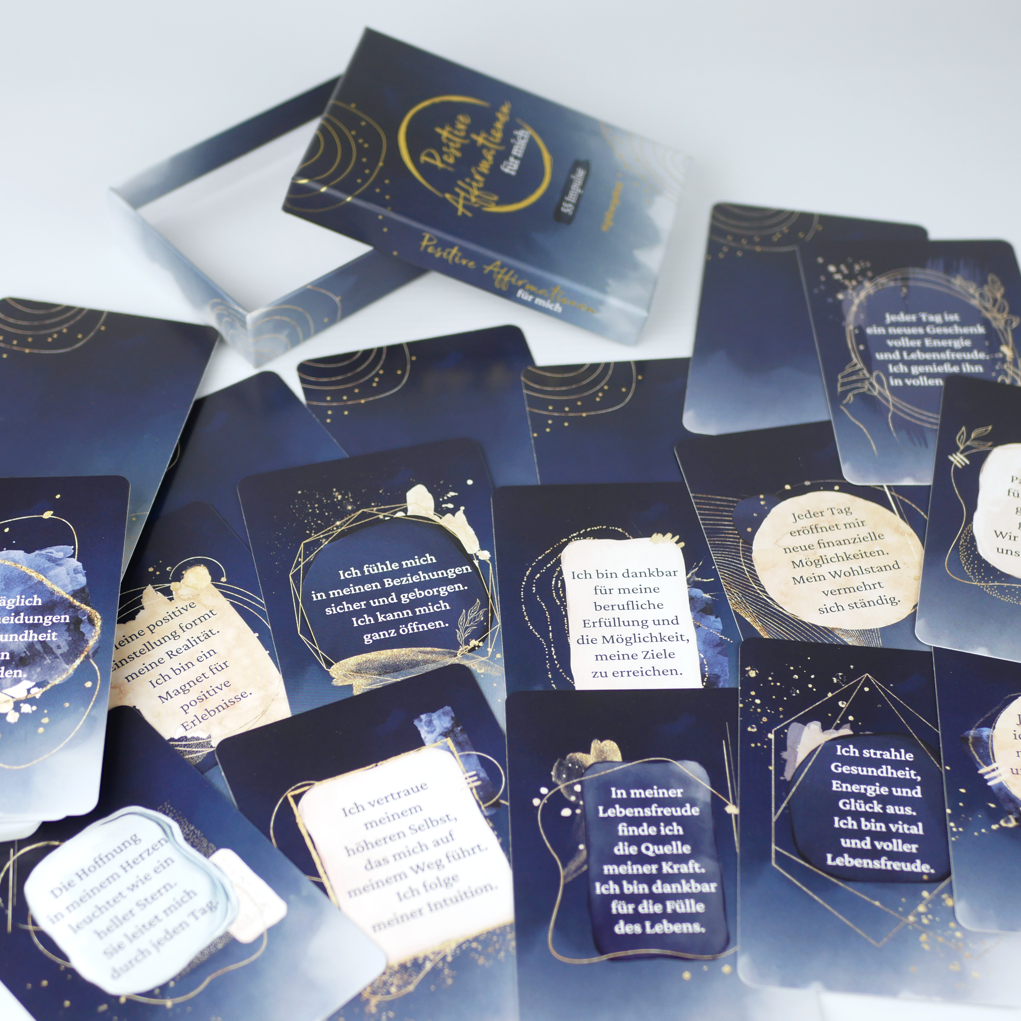 In einer oft hektischen und herausfordernden Welt ist dieses Kartenset eine wertvolle Quelle für neue Impulse und inspirierende Antworten. Das liebevoll gestaltete Set besteht aus 55 Karten, jede mit einer kraftvollen und inspirierenden Affirmation, die dir helfen wird, positive Energie in jeden Bereich deines Lebens zu bringen.In diesem Kartenset findest du Affirmationen für Gesundheit, Wohlstand, Liebe, Selbstakzeptanz, Karriere und viele andere Themen. Jede Karte ist ein kleines Kunstwerk, das nicht nur das Auge erfreut, sondern auch die Seele berührt. Die Karten enthalten mehr als nur Worte - sie helfen dir, deine Gedanken zu fokussieren und deine Energie auf das zu richten, was du in deinem Leben manifestieren möchtest.Ziehe jeden Tag eine Karte und lasse die Affirmation auf dich wirken. Du wirst sehen, wie sich mit der Zeit deine Einstellung positiv verändert und du die Kraft der Affirmationen in deinem Alltag erlebst.Das edle Design in Dunkelblau und Gold sowie die hochwertige Verpackung in einer stabilen Box machen dieses Kartenset zu einem perfekten Geschenk für jeden Anlass. Ob zu Hause, im Büro oder unterwegs - das handliche Format macht das Set zum idealen Begleiter in jeder Lebenslage. Starte jetzt in einen bewussteren Alltag voller Achtsamkeit, Kraft und positiver Energie.Die Fakten:-55 Karten mit kraftvollen Affirmationen für jeden Tag-Positive Affirmationen zu wichtigen Themen wie Gesundheit, Karriere, Wohlstand und Beziehungen-Handliches Format (8x12 cm): ideal für unterwegs-Edles blau-goldenes Design: das perfekte Geschenk für jede Gelegenheit-Hochwertige Verpackung: eine stabile Box, die man jeden Tag gerne öffnet-Für mehr Achtsamkeit, Bewusstheit und Kraft