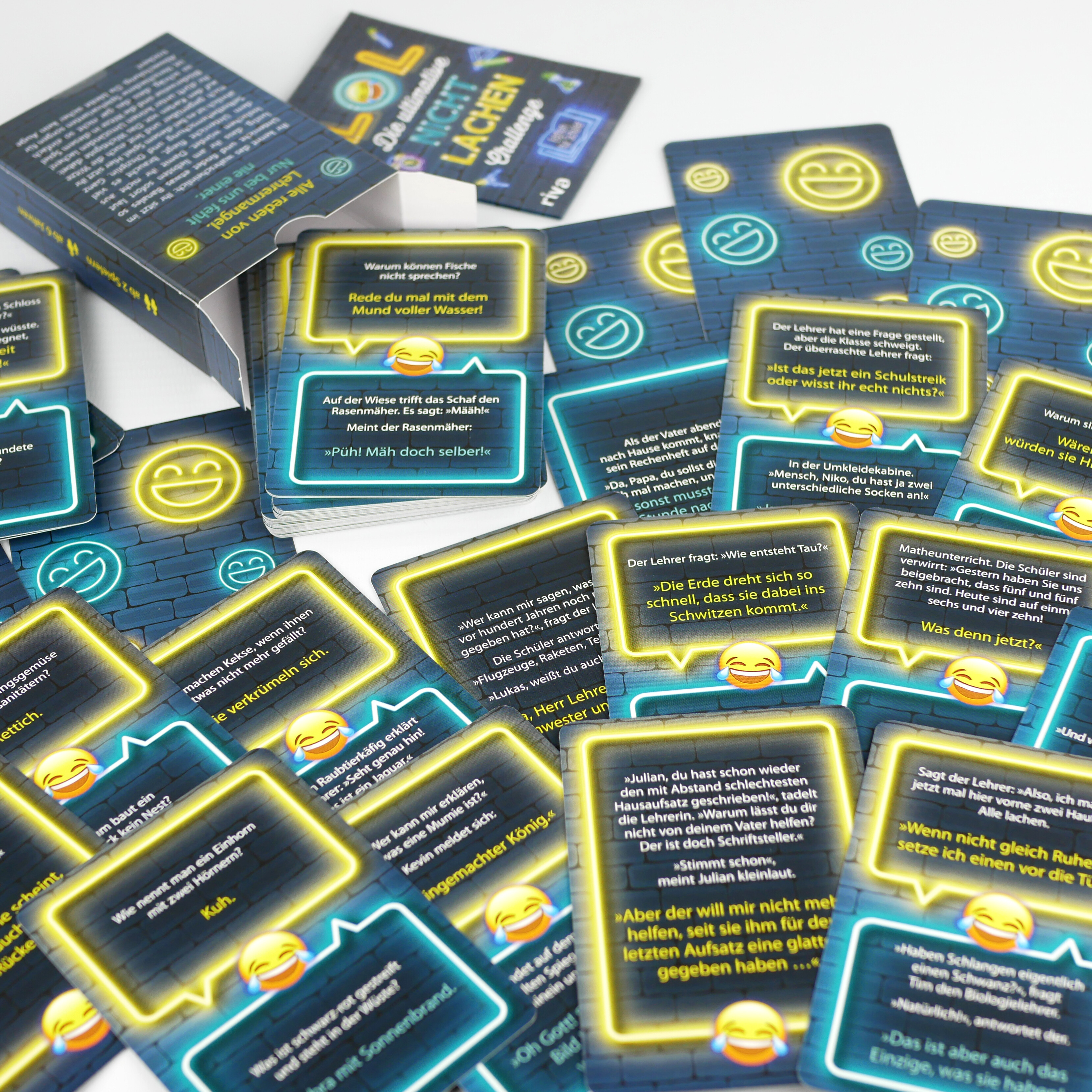 Viele kennen es: Man sitzt im Unterricht und findet etwas Banales so lustig, dass man am liebsten sofort laut loslachen würde. Doch damit man nicht aus dem Unterricht fliegt, braucht es viel Selbstbeherrschung und Disziplin. Fast so wie bei diesem Spiel.»LOL - Die ultimative Nicht-lachen-Challenge« gibt es nun endlich in einer Version für Schüler. Dabei sitzen sich die Spieler gegenüber und lesen sich die Witze auf den Karten vor. Das Wichtigste dabei: Sie dürfen unter keinen Umständen lachen! Blöderweise sind die Witze in diesem Spiel so schräg, dass das gar nicht so einfach ist. Neben zahlreichen Flachwitzen und lustigen Wortspielen erwarten die Spieler hier eine ausführliche Spielanleitung sowie einige verrückte Spielvarianten. Ob für die große Pause oder den Klassenausflug - der Versuch, keinen Spaß zu haben, hat noch nie so viel Spaß gemacht!