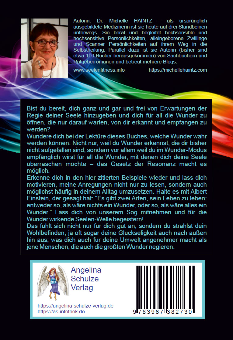 Autorin: Dr. Michelle HAINTZ Als ursprünglich ausgebildete Ärztin ist die Autorin heute vorwiegend als Schriftstellerin und bildende Künstlerin tätig: sie schreibt Romane, Sachbücher und Gedichte. Darüber hinaus kreiert sie Reliefbilder und Wandobjekte in der neu von ihr entwickelten Laminage-Technik. In ihrer Tätigkeit als Persönlichkeits-Trainerin (in Seminaren und in der Einzelberatung) liegt ihr Schwerpunkt in der freudigen und lustvollen Entfaltung des in uns allen angelegten menschlichen Potenzials auf allen Ebenen unseres Seins! Wichtigstes Credo ist ihr: „Wir brauchen nicht über uns selbst hinaus zu wachsen, wir sind groß genug, wenn wir damit aufhören, uns selbst kleiner zu machen, als wir sind; aber auch Anderen nicht mehr erlauben, uns klein zu machen! Es gilt also letztlich, in uns selbst hinein zu wachsen und unsere wahre Größe einzunehmen!“ Schwerpunktthema ist die Begleitung alleingeborener Zwillinge (und Drillinge) sowie Hochsensibler und Hochsensitiver auf ihrem Weg in die Bewusstwerdung und Heilung ihres Verlust-Traumas. www.michellehaintz.at
