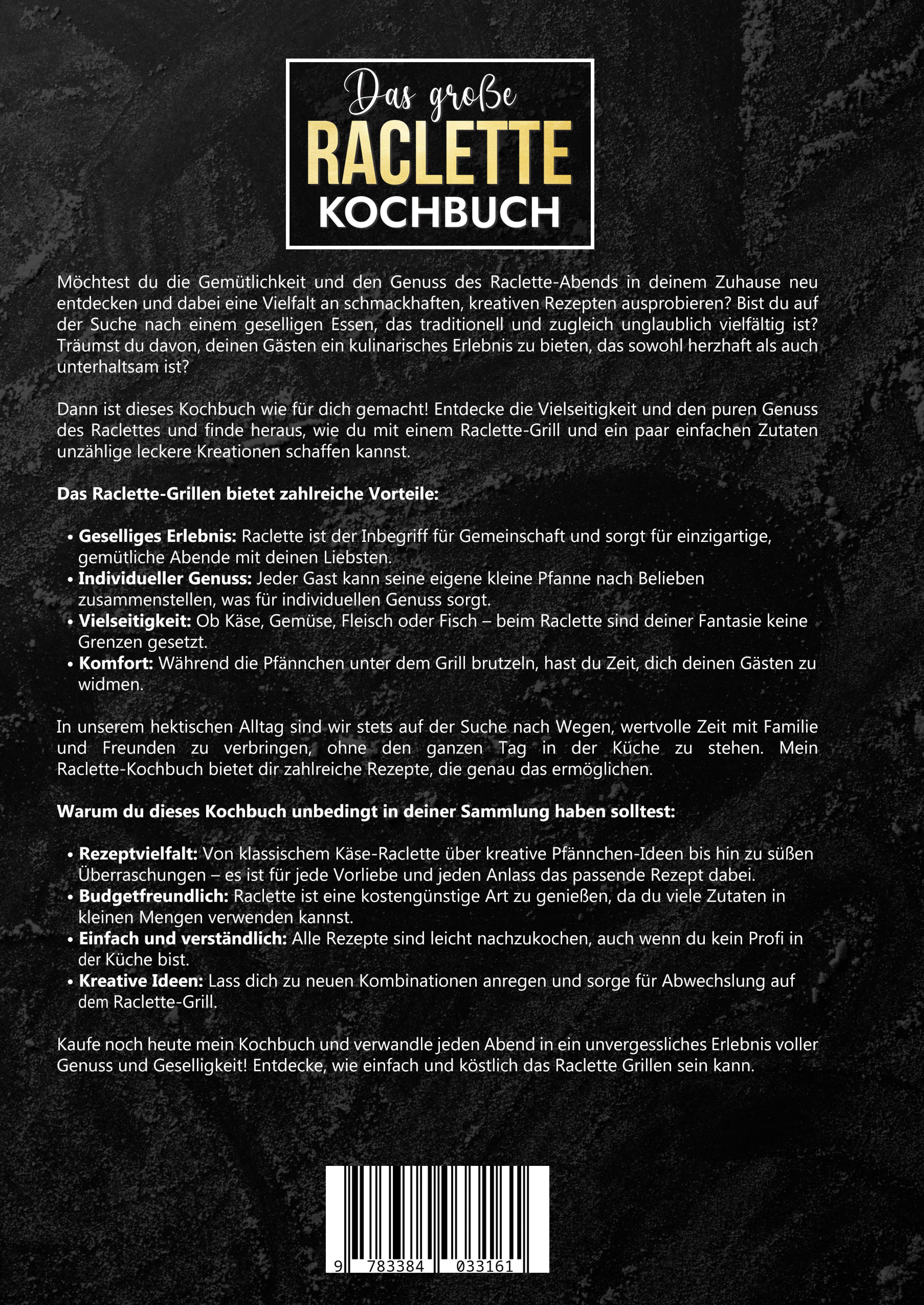 Möchtest du die Gemütlichkeit und den Genuss des Raclette-Abends in deinem Zuhause neu entdecken und dabei eine Vielfalt an schmackhaften, kreativen Rezepten ausprobieren? Bist du auf der Suche nach einem geselligen Essen, das traditionell und zugleich unglaublich vielfältig ist? Träumst du davon, deinen Gästen ein kulinarisches Erlebnis zu bieten, das sowohl herzhaft als auch unterhaltsam ist?Dann ist dieses Kochbuch wie für dich gemacht! Entdecke die Vielseitigkeit und den puren Genuss des Raclettes und finde heraus, wie du mit einem Raclette-Grill und ein paar einfachen Zutaten unzählige leckere Kreationen schaffen kannst.Das Raclette-Grillen bietet zahlreiche Vorteile:- Geselliges Erlebnis: Raclette ist der Inbegriff für Gemeinschaft und sorgt für einzigartige, gemütliche Abende mit deinen Liebsten.- Individueller Genuss: Jeder Gast kann seine eigene kleine Pfanne nach Belieben zusammenstellen, was für individuellen Genuss sorgt.- Vielseitigkeit: Ob Käse, Gemüse, Fleisch oder Fisch - beim Raclette sind deiner Fantasie keine Grenzen gesetzt.- Komfort: Während die Pfännchen unter dem Grill brutzeln, hast du Zeit, dich deinen Gästen zu widmen.In unserem hektischen Alltag sind wir stets auf der Suche nach Wegen, wertvolle Zeit mit Familie und Freunden zu verbringen, ohne den ganzen Tag in der Küche zu stehen. Dieses Raclette Kochbuch bietet dir zahlreiche Rezepte, die genau das ermöglichen.Warum du dieses Kochbuch unbedingt in deiner Sammlung haben solltest:- Rezeptvielfalt: Von klassischem Käse-Raclette über kreative Pfännchen-Ideen bis hin zu süßen Überraschungen - es ist für jede Vorliebe und jeden Anlass das passende Rezept dabei.- Budgetfreundlich: Raclette ist eine kostengünstige Art zu genießen, da du viele Zutaten in kleinen Mengen verwenden kannst.- Einfach und verständlich: Alle Rezepte sind leicht nachzukochen, auch wenn du kein Profi in der Küche bist.- Kreative Ideen: Lass dich zu neuen Kombinationen anregen und sorge für Abwechslung auf dem Raclette-Grill.Kaufe noch dieses Kochbuch und verwandle jeden Abend in ein unvergessliches Erlebnis voller Genuss und Geselligkeit! Entdecke, wie einfach und köstlich das Raclette Grillen sein kann.