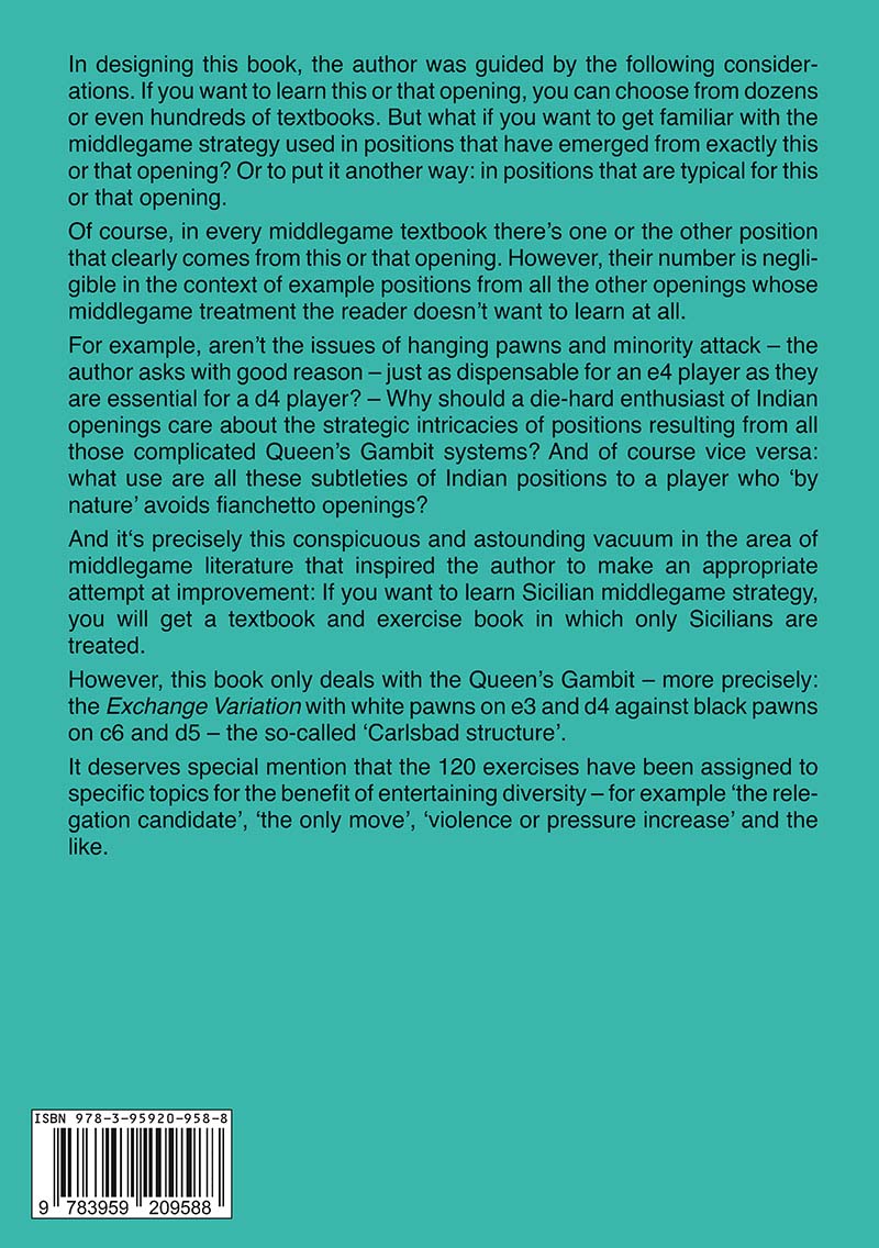In designing this book, the author was guided by the following considerations. If you want to learn this or that opening, you can choose from dozens or even hundreds of textbooks. But what if you want to get familiar with the middlegame strategy used in positions that have emerged from exactly this or that opening? Or to put it another way: in positions that are typical for this or that opening.Of course, in every middlegame textbook there's one or the other position that clearly comes from this or that opening. However, their number is negligible in the context of example positions from all the other openings whose middlegame treatment the reader doesn't want to learn at all.For example, aren't the issues of hanging pawns and minority attack - the author asks with good reason - just as dispensable for an e4 player as they are essential for a d4 player? - Why should a die-hard enthusiast of Indian openings care about the strategic intricacies of positions resulting from all those complicated Queen's Gambit systems? And of course vice versa: what use are all these subtleties of Indian positions to a player who 'by nature' avoids fianchetto openings?And it's precisely this conspicuous and astounding vacuum in the area of middlegame literature that inspired the author to make an appropriate attempt at improvement: If you want to learn Sicilian middlegame strategy, you will get a textbook and exercise book in which only Sicilians aretreated.However, this book only deals with the Queen's Gambit - more precisely: the Exchange Variation with white pawns on e3 and d4 against black pawns on c6 and d5 - the so-called 'Carlsbad structure'.It deserves special mention that the 120 exercises have been assigned to specific topics for the benefit of entertaining diversity - for example 'the relegation candidate', 'the only move', 'violence or pressure increase' and the like.