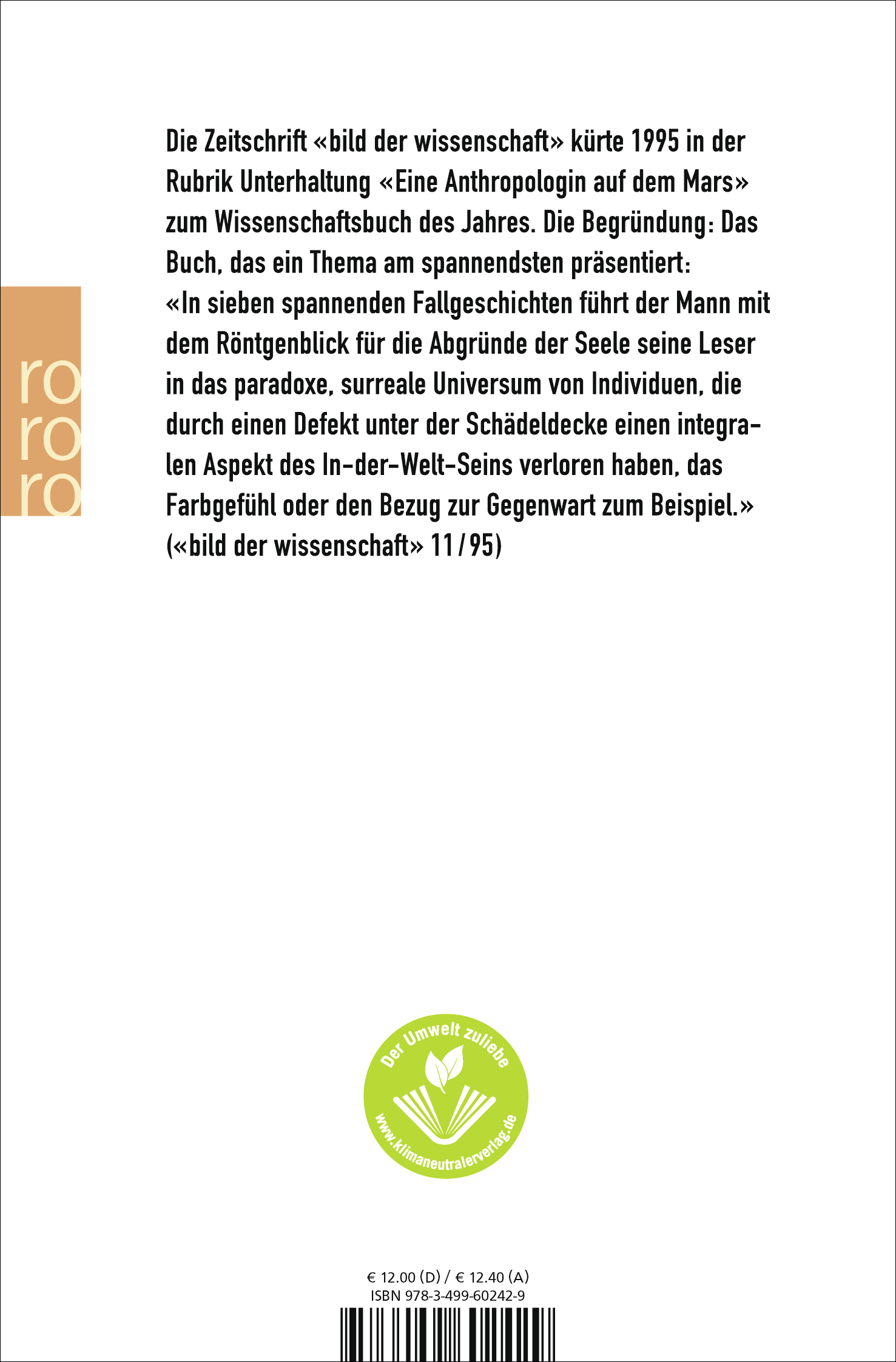 In sieben spannenden Fallgeschichten führt der Mann mit dem Röntgenblick für die Abgründe der Seele seine Leser in das paradoxe, surreale Universum von Individuen, die durch einen Defekt unter der Schädeldecke einen integralen Aspekt des In-der-Welt-Seins verloren haben, das Farbgefühl oder den Bezug zur Gegenwart zum Beispiel. Bild der Wissenschaft