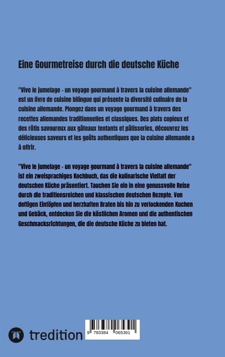 "Vive le jumelage - un voyage gourmand à travers la cuisine allemande" est un livre de cuisine bilingue qui présente la diversité culinaire de la cuisine allemande. Plongez dans un voyage gourmand à travers des recettes allemandes traditionnelles et classiques. Des plats copieux et des rôtis savoureux aux gâteaux tentants et pâtisseries, découvrez les délicieuses saveurs et les goûts authentiques que la cuisine allemande a à offrir.Ce livre de cuisine établit un lien unique entre la culture allemande et française et vous permet de découvrir les trésors culinaires des deux pays. Chaque recette est présentée en allemand et en français pour faciliter la préparation et la compréhension. Des classiques bien connus comme la choucroute et les saucisses aux plats moins connus comme les spätzle au fromage et la forêt-noire, vous serez inspiré pour expérimenter la cuisine allemande variée dans votre propre cuisine."Vive le jumelage - un voyage gourmand à travers la cuisine allemande" n'est pas seulement un livre de cuisine, mais aussi un hommage à la connexion culturelle entre l'Allemagne et la France. Laissez-vous charmer par les délicieuses recettes et les anecdotes charmantes sur la cuisine allemande. Que vous soyez un chef expérimenté ou un novice en cuisine, ce livre vous aidera à maîtriser les plats allemands traditionnels et à créer des expériences culinaires inoubliables.Découvrez le monde culinaire de l'Allemagne et de la France avec ce livre de cuisine bilingue unique, qui associe goût et culture. Partez pour un voyage culinaire délicieux et laissez la cuisine allemande choyer vos sens et enrichir vos talents culinaires. Bon appétit et guten Appetit !"Vive le jumelage - un voyage gourmand à travers la cuisine allemande" ist ein zweisprachiges Kochbuch, das die kulinarische Vielfalt der deutschen Küche präsentiert. Tauchen Sie ein in eine genussvolle Reise durch die traditionsreichen und klassischen deutschen Rezepte. Von deftigen Eintöpfen und herzhaften Braten bis hin zu verlockenden Kuchen und Gebäck, entdecken Sie die köstlichen Aromen und die authentischen Geschmacksrichtungen, die die deutsche Küche zu bieten hat.Dieses Kochbuch bietet eine einzigartige Verbindung zwischen der deutschen und französischen Kultur und lässt Sie die kulinarischen Schätze beider Länder entdecken. Jedes Rezept wird sowohl in deutscher als auch in französischer Sprache präsentiert, um eine leichte Zubereitung und Verständigung zu ermöglichen. Von bekannten Klassikern wie Sauerkraut und Bratwurst bis hin zu weniger bekannten Gerichten wie Käsespätzle und Schwarzwälder Kirschtorte, werden Sie inspiriert, die vielfältige deutsche Küche in Ihrer eigenen Küche zu erleben."Vive le jumelage - un voyage gourmand à travers la cuisine allemande" ist nicht nur ein Kochbuch, sondern auch eine Hommage an die kulturelle Verbundenheit zwischen Deutschland und Frankreich. Lassen Sie sich von den leckeren Rezepten und den charmanten Anekdoten über die deutsche Küche verzaubern. Ob Sie ein erfahrener Koch oder ein Neuling in der Küche sind, dieses Buch wird Ihnen helfen, traditionelle deutsche Gerichte zu meistern und unvergessliche kulinarische Erlebnisse zu schaffen.Entdecken Sie die kulinarische Welt Deutschlands und Frankreichs mit diesem einzigartigen zweisprachigen Kochbuch - eine perfekte Verbindung aus Geschmack und Kultur. Gehen Sie auf eine köstliche Reise und erleben Sie, wie die deutsche Küche Ihre Sinne verwöhnt und Ihre Kochkünste bereichert. Guten Appetit und bon appétit!