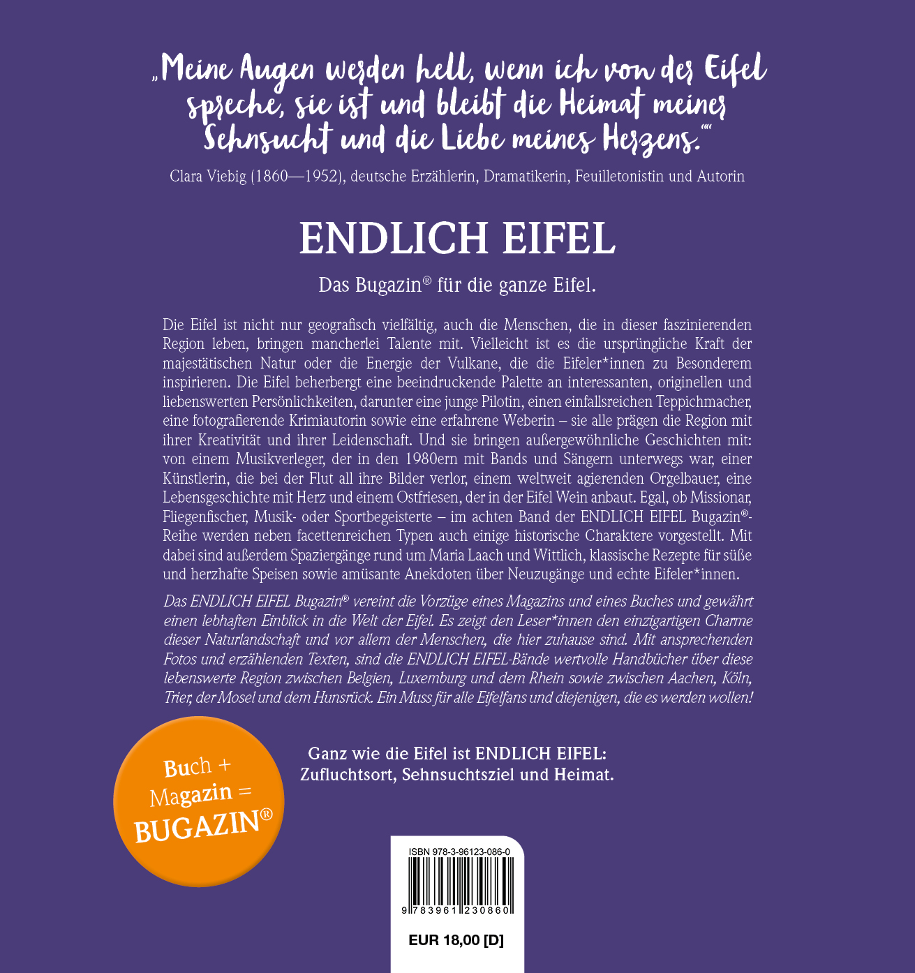 Jeannette Fentroß, erfahrene Redakteurin und Wahlkölnerin, verantwortet gemeinsam mit Stephan Falk als Herausgeber und Chefredaktion das mit viel Engagement und Leidenschaft gestaltetes Herzensprojekt »Endlich Eifel«. Neben den regelmäßig erscheinenden Bugazin-Bänden realisieren beide weitere innovative Medien-Projekte rund um die Eifel und um Köln.