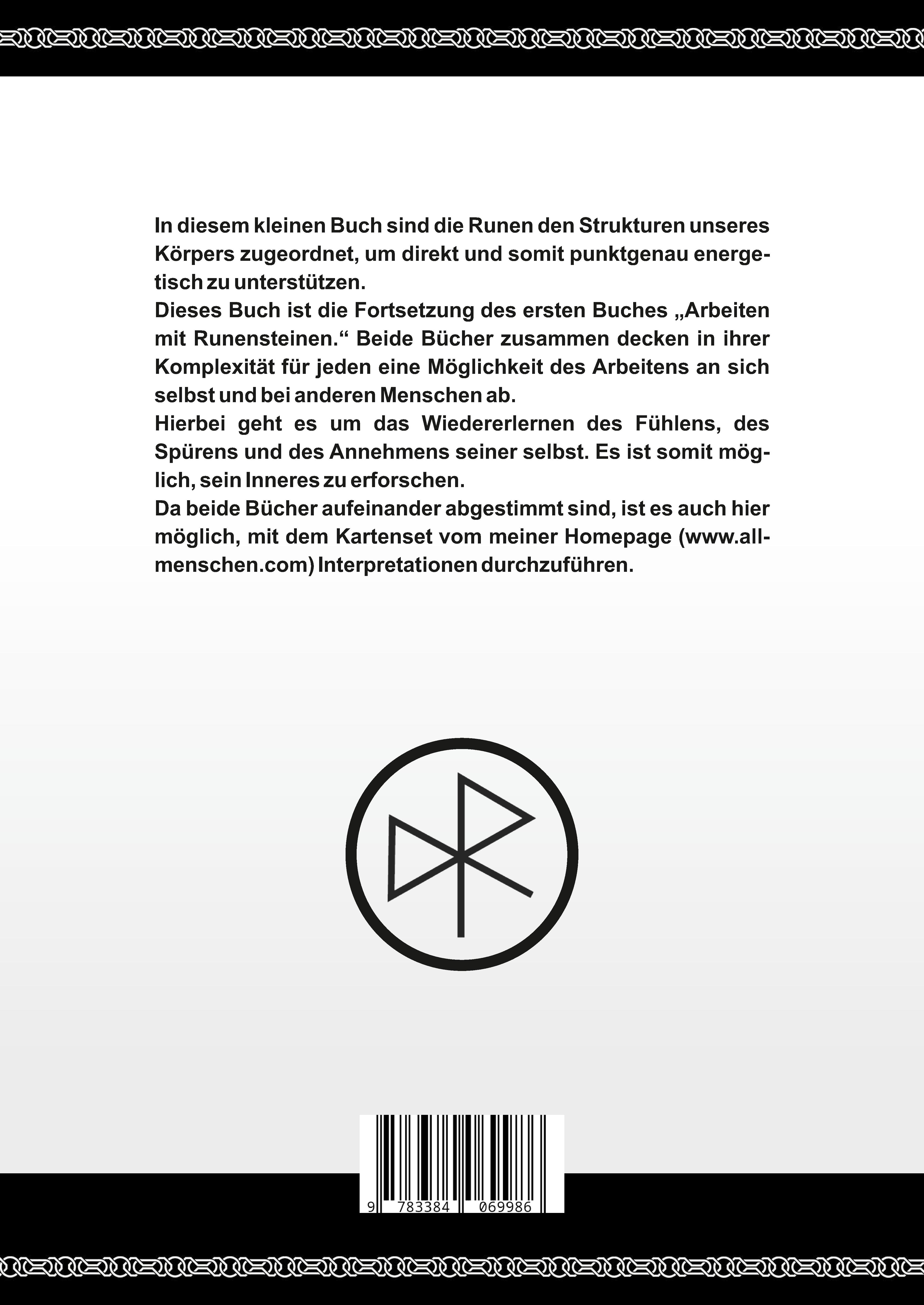 In diesem kleinen Buch sind die Runen den Strukturen unseres Körpers zugeordnet, um direkt und somit punktgenau energetisch zu unterstützen.Dieses Buch ist die Fortsetzung des ersten Buches "Arbeiten mit Runensteinen." Beide Bücher zusammen decken in ihrer Komplexität für jeden eine Möglichkeit des Arbeitens an sich selbst und bei anderen Menschen ab.Hierbei geht es um das Wiedererlernen des Fühlens, des Spürens und des Annehmens seiner selbst. Es ist somit möglich, sein Inneres zu erforschen.Da beide Bücher aufeinander abgestimmt sind, ist es auch hier möglich, mit dem Kartenset vom meiner Homepage (www.allmenschen.com) Interpretationen durchzuführen.