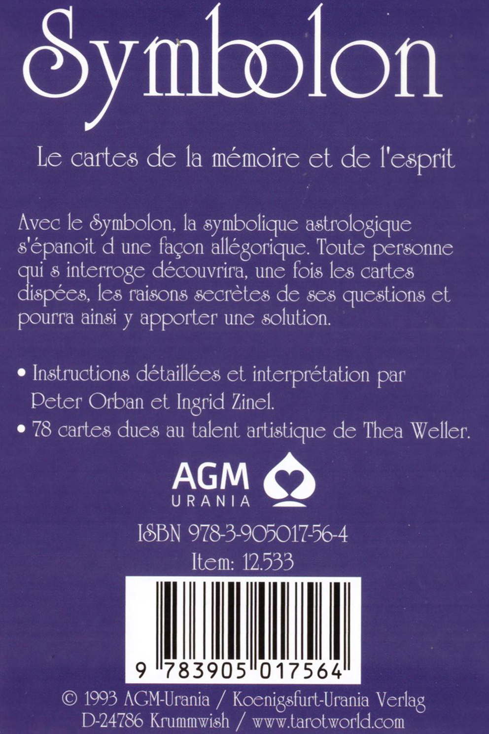 Les Cartes de la Mémoire - Avec le Symbolon, la symbolique astrologique s'épanouit d'une façon allégorique. Toute personne qui s'interroge découvrira, une fois les cartes disposées, les raisons secrètes de ses questions et pourra ainsi y apporter une solution. Instructions détaillées et interprétation par Peter Orban et Ingrid Zinnel 78 cartes dues au talent artistique de Thea Weller.