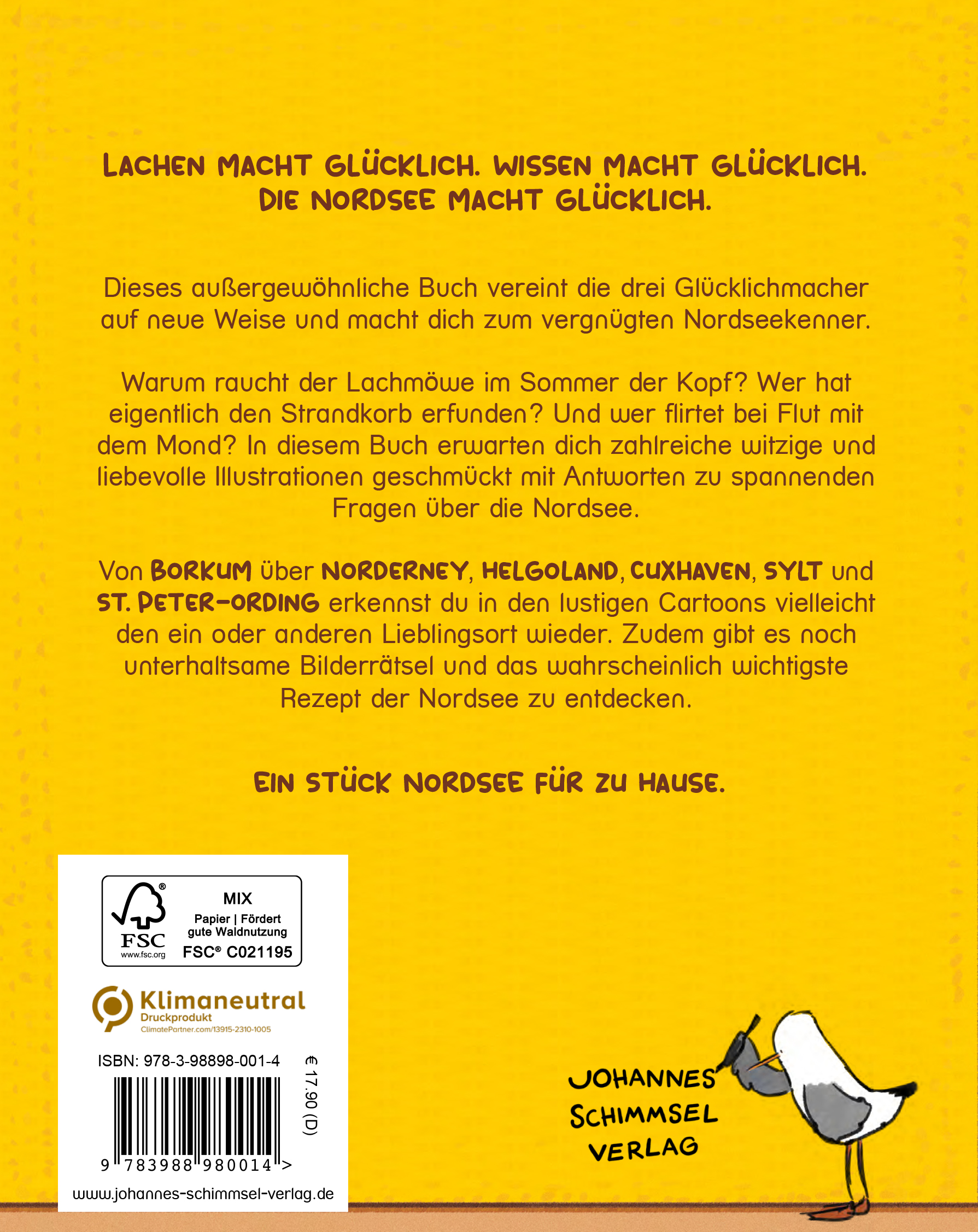 Lachen macht glücklich. Wissen macht glücklich. Die Nordsee macht glücklich.Dieses außergewöhnliche Buch vereint die drei Glücklichmacher auf neue Weise und macht dich zum vergnügten Nordseekenner.Warum raucht der Lachmöwe im Sommer der Kopf? Wer hat eigentlich den Strandkorb erfunden? Und wer flirtet bei Flut mit dem Mond? In diesem Buch erwarten dich zahlreiche witzige und liebevolle Illustrationen geschmückt mit Antworten zu spannenden Fragen über die Nordsee.Von Borkum über Norderney, Helgoland, Cuxhaven, Sylt und St. Peter-Ording erkennst du in den lustigen Cartoons vielleicht den ein oder anderen Lieblingsort wieder. Zudem gibt es noch unterhaltsame Bilderrätsel und das wahrscheinlich wichtigste Rezept der Nordsee zu entdecken.Ein Stück Nordsee für zu Hause.