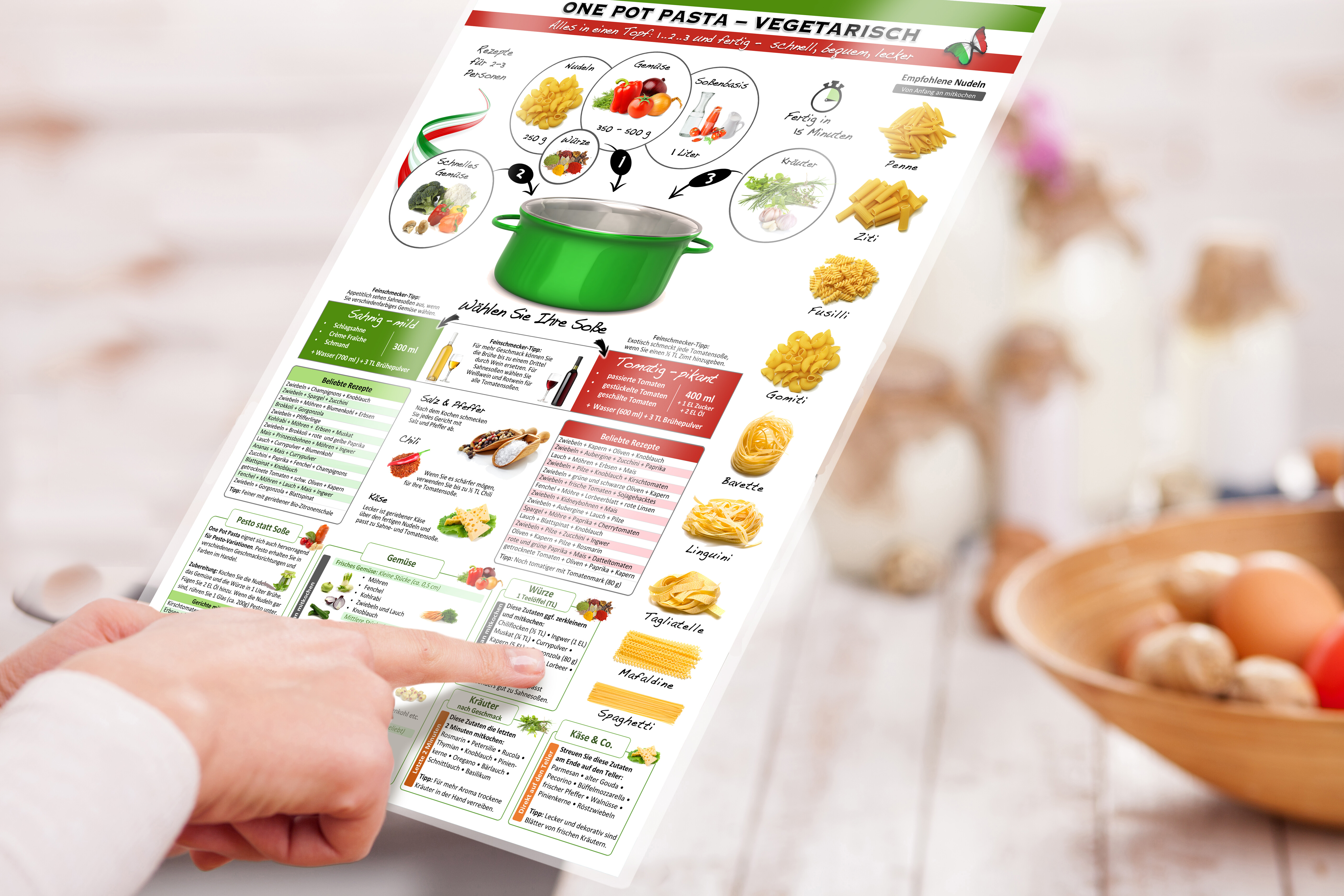 Die Mix & Cook Kartenküche ist der Schlüssel zu genussvollen Momenten, Fitness und effizientem Küchenzauber. Dies 7-teilige Set , laminiert und im praktischen DINA4-Format , bringt Grüne Smoothies, schnelle Pasta und stimmungsvolle Cocktails direkt in deine Küche. Bleibe fit, spare Zeit und genieße jeden Tag mit Leichtigkeit und Geschmack!