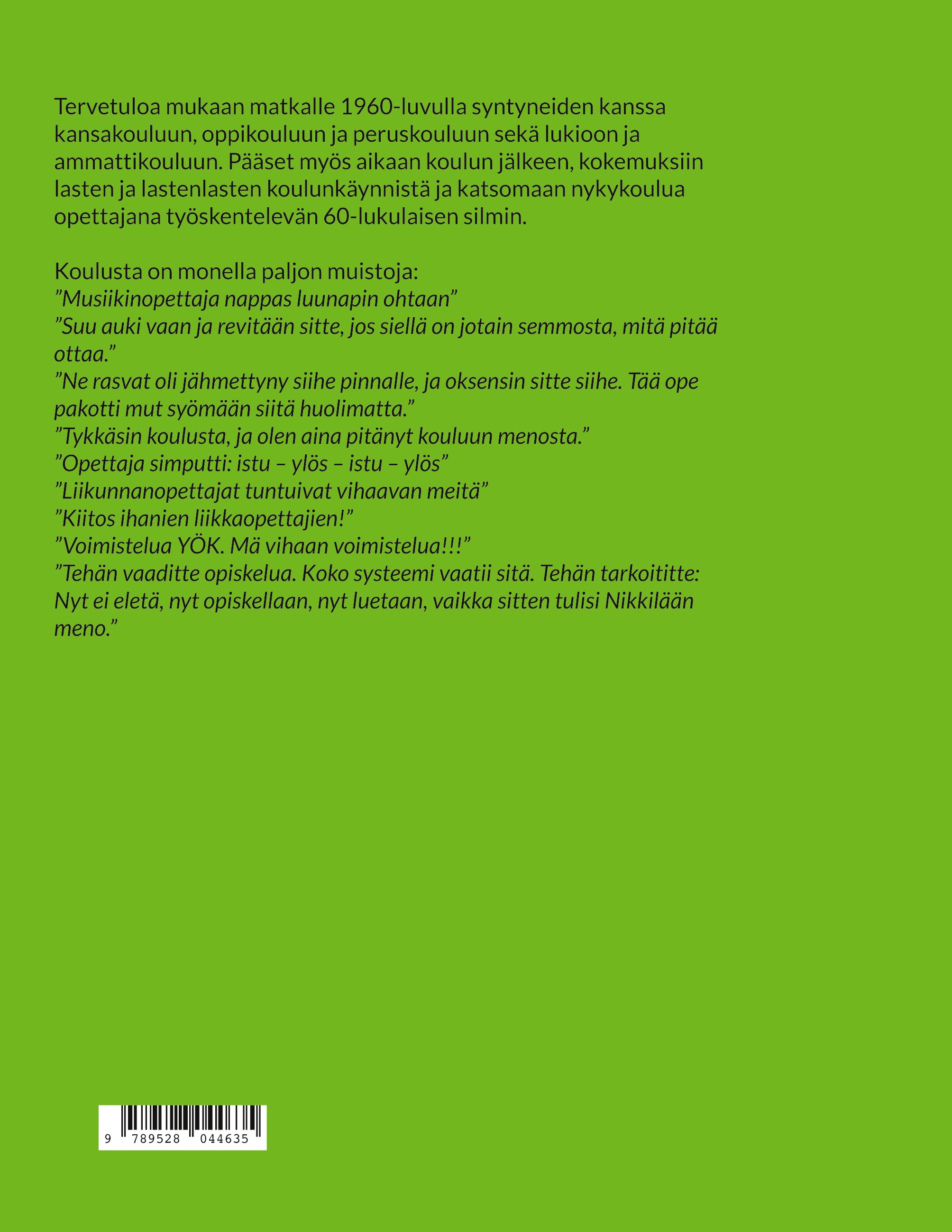 Kirja kertoo 1960-luvulla syntyneiden koulukokemuksista kansa- ja oppi-/peruskoulussa sekä lukiossa ja ammattikoulussa. Mukana on myös kokemuksia koulun jälkeen sekä lasten ja lastenlasten tai nyt opettajana työskentelystä. Tarinat peilaavat myös kodin ja yhteiskunnan murrosta 1960- ja 1970-luvulla sekä koulun muuttumista 1990-2020-luvuilla. Kirjaan on poimittu taustatietoa kirjallisuudesta ja lehdistä kuvaamaan ajan henkeä.