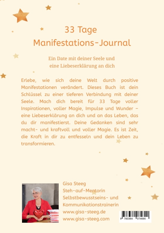 | Schlagworte | 33-Tage-Journal • Ein Date mit deiner Seele, • Eine Reise zu dir selbst, • Gisa Steeg, • journal, • Journaling, • Lebensfreude, • Lebensplanung, • Manifestation, • Manifestieren, • Power, • Powerimpulse, • Reise zu dir selbst, • Resilienz, • Resilienz rockt, • Ruhe für die Seele, • Tagesimpulse, • Wunder kreieren, |