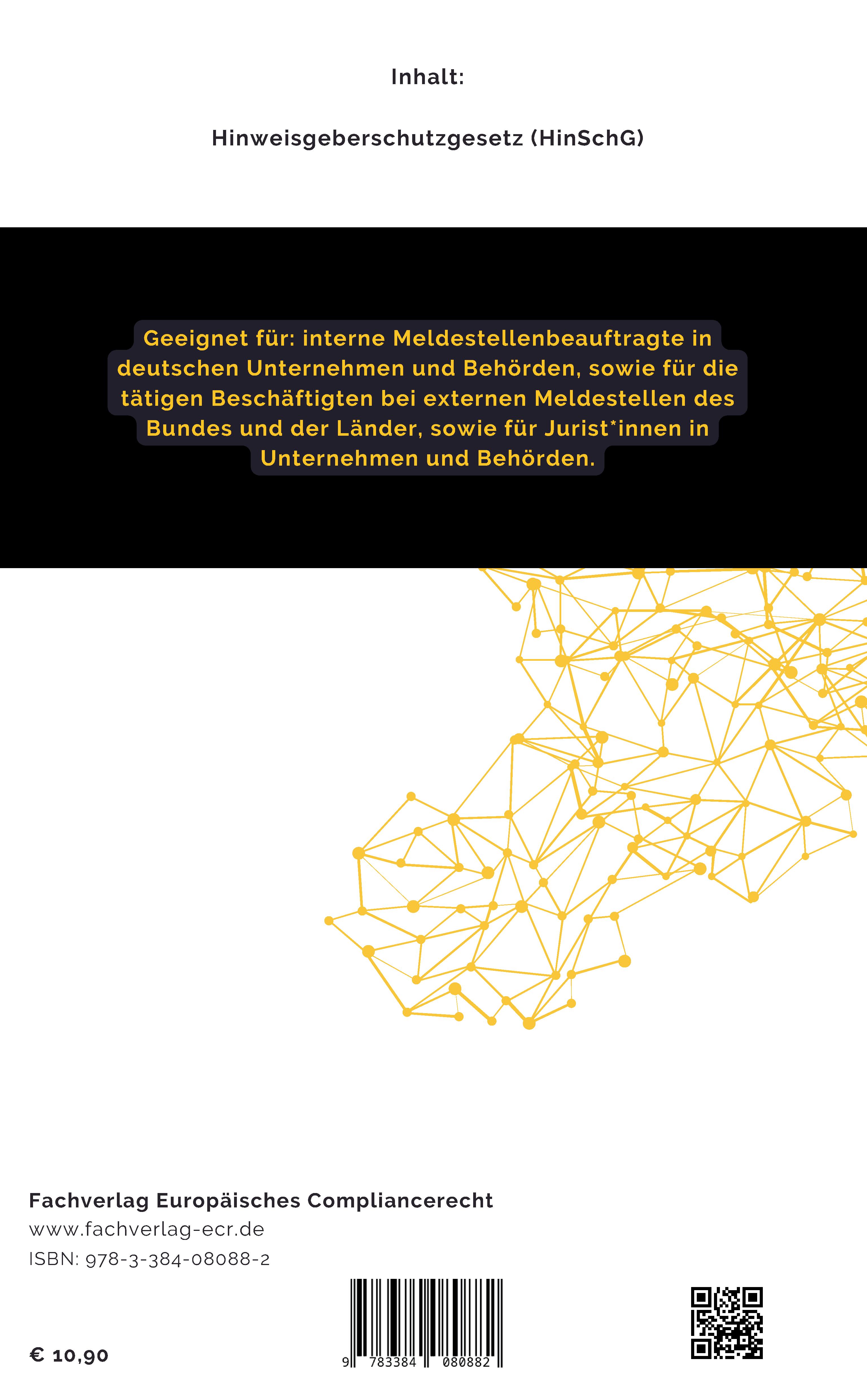 Das Hinweisgeberschutzgesetz (HinSchG) als Gesetzestext im praktischen Textbuch-Format des Fachverlages Europäisches Compliancerecht.Für interne Meldestellenbeauftragte in deutschen Unternehmen und Behörden, sowie für die tätigen Beschäftigten bei externen Meldestellen des Bundes und der Länder, sowie für Jurist*innen in Unternehmen und Behörden.