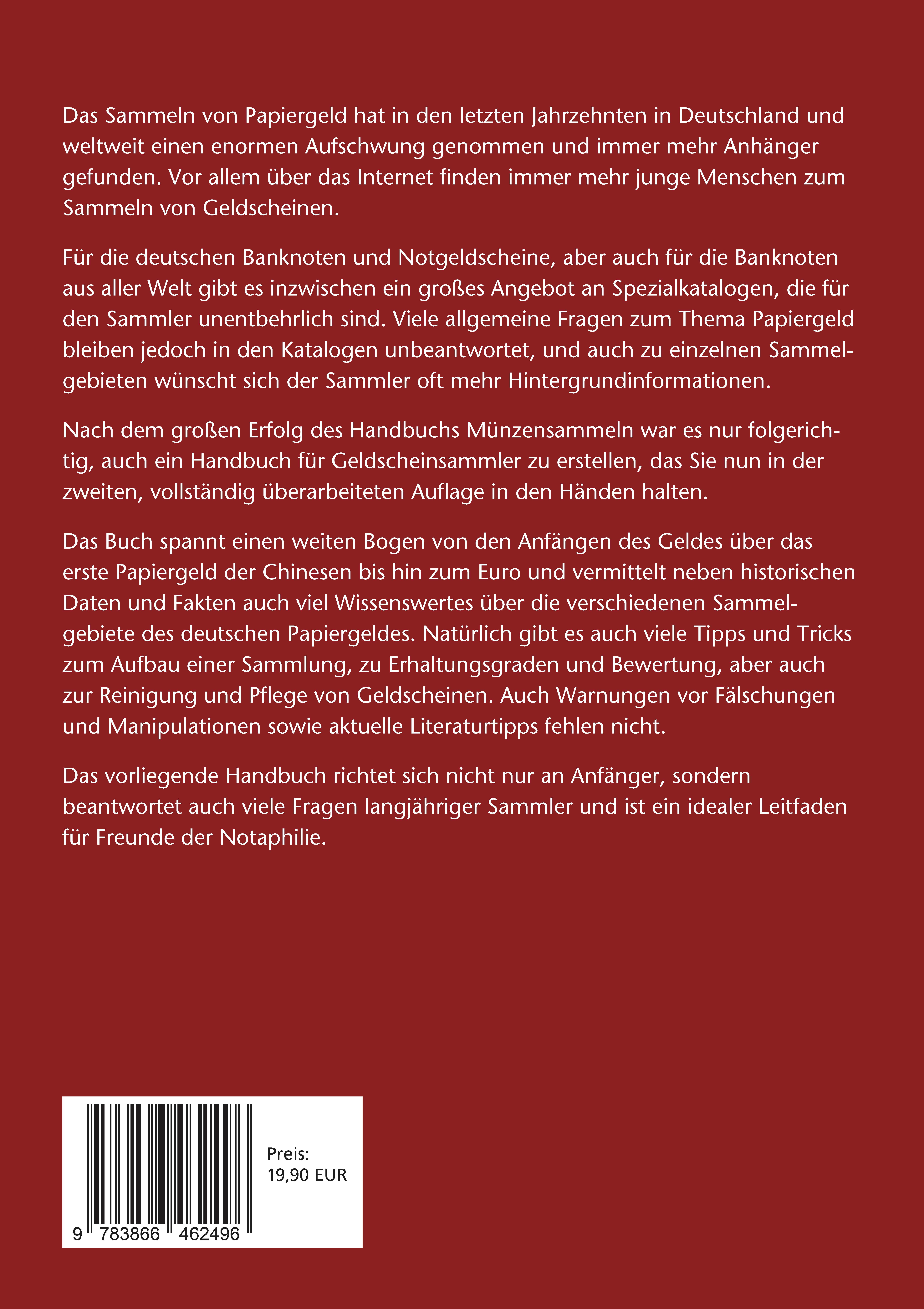 Das Papiergeldsammeln hat in den letzten Jahrzehnten in Deutschland und weltweit einen enormen Aufschwung erfahren und immer mehr Anhänger gefunden. Besonders über das Internet kommen immer mehr junge Leute zum Geldscheinsammeln. Inzwischen gibt es ein großes Angebot an Spezialkatalogen für deutsche Banknoten und Notgeldscheine wie auch für Weltbanknoten, die für den Sammler unentbehrlich sind. Viele allgemeine Fragen zum Thema Papiergeld bleiben aber in den Katalogen unbeantwortet und selbst zu einzelnen Sammelgebieten würde sich der Sammler oft mehr Hintergrundinformationen wünschen. Nach dem großen Erfolg des Handbuchs Münzensammeln war es nur logisch, auch ein Handbuch für Geldscheinsammler vorzubereiten. Die neue Auflage spannt einen weiten Bogen von den Anfängen des Geldes über frühes Papiergeld der Chinesen bis hin zum Euro und vermittelt dabei neben historischen Daten und Fakten auch viel Wissenswertes rund um die verschiedenen Sammelgebiete deutschen Papiergelds. Dabei werden natürlich auch viele Tipps und Tricks, wie etwa zum Aufbau einer Sammlung, zu Erhaltungsgraden und zur Bewertung, aber auch zur Reinigung und Pflege von Geldscheinen gegeben. Natürlich fehlen auch Warnungen vor Fälschungen und Manipulationen sowie aktuelle Literaturempfehlungen nicht. Das vorliegende Handbuch ist dabei keineswegs nur für Anfänger gedacht, sondern beantwortet auch viele Fragen für langjährige Sammler und ist ein idealer Leitfaden für Freunde der Notaphilie.