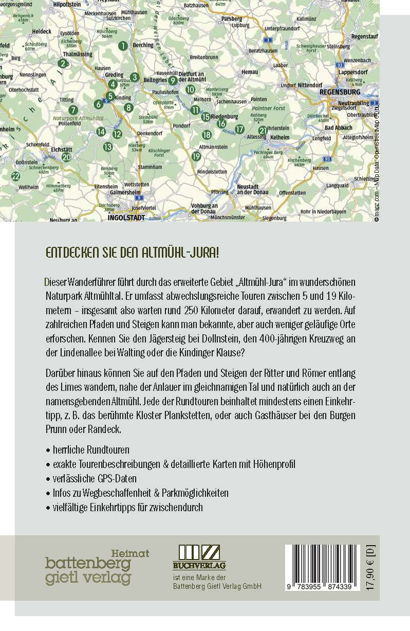 Dieser Wanderführer führt durch das erweiterte Gebiet "Altmühl-Jura" im wunderschönen Naturpark Altmühltal. Er umfasst abwechslungsreiche Touren zwischen 5 und 19 Kilometern - insgesamt also warten rund 250 Kilometer darauf, erwandert zu werden. Auf zahlreichen Pfaden und Steigen kann man bekannte, aber auch weniger geläufige Orte erforschen. Kennen Sie den Jägersteig bei Dollnstein, den 400-jährigen Kreuzweg an der Lindenallee bei Walting oder die Kindinger Klause?Darüber hinaus können Sie auf den Pfaden und Steigen der Ritter und Römer entlang des Limes wandern, nahe der Anlauter im gleichnamigen Tal und natürlich auch an der namensgebenden Altmühl. Jede der Rundtouren beinhaltet mindestens einen Einkehrtipp, z.B. das berühmte Kloster Plankstetten, oder auch Gasthäuser bei den Burgen Prunn oder Randeck.Dieser Wanderführer bietet Ihnen- herrliche Rundtouren- exakte Tourenbeschreibungen- Infos zur Wegbeschaffenheit- detaillierte Karten mit Höhenprofil- verlässliche GPS-Daten- Infos zu Parkmöglichkeiten- vielfältige Einkehrtipps für zwischendurch
