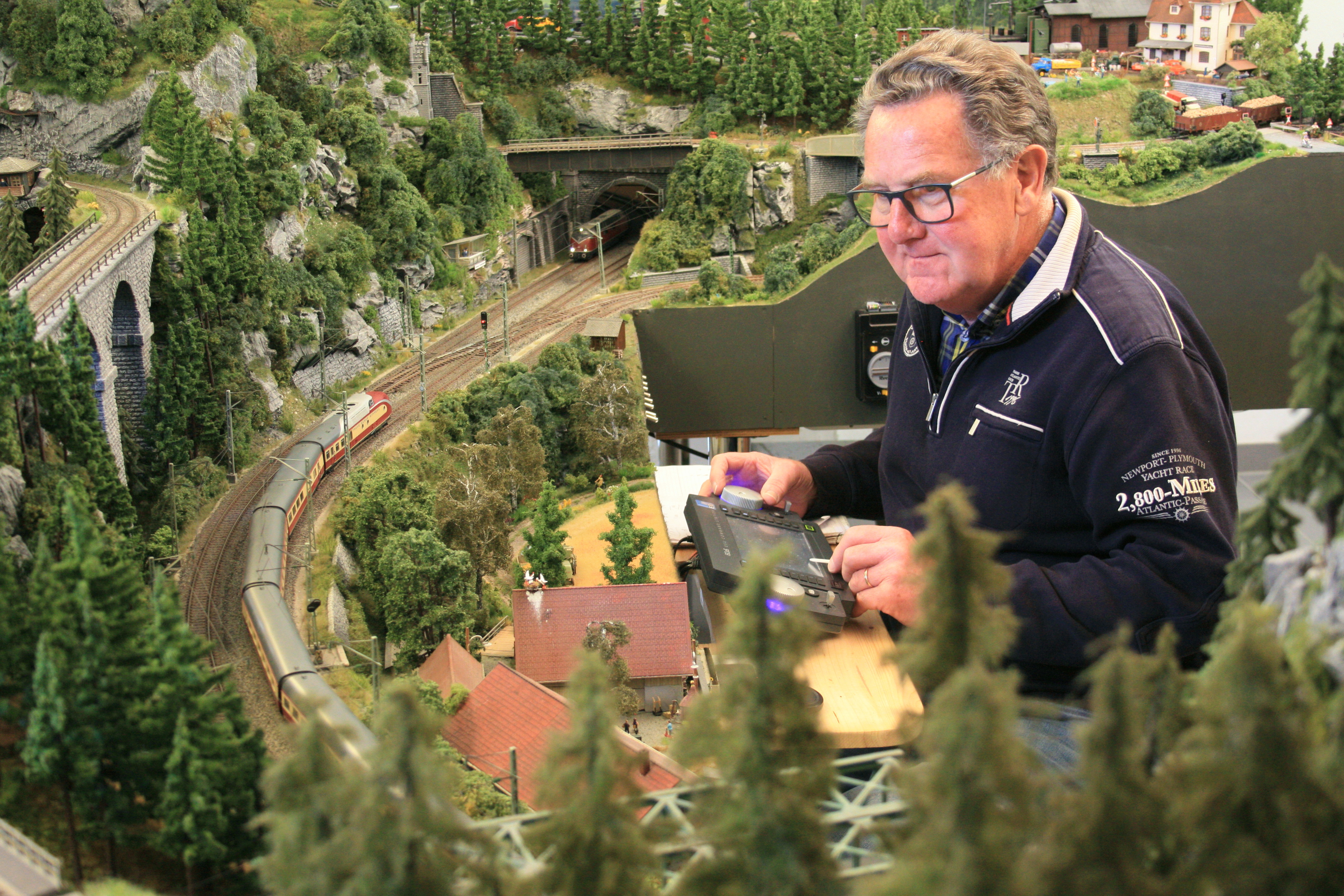 Karl Gebele, Geburtsjahrgang 1947, wurde schon in frühester Jugend mit dem Modellbahnvirus infiziert: Etwa im Jahr 1950 bekam er zusammen mit seinen zwei Brüdern eine Märklin-Eisenbahn geschenkt. Sie bestand aus je einem Gleisoval für jedes Kind und langweilte den kleinen Karl rasch. Bereits mit sechs Jahren fing er an, für eine eigene Anlage zu sparen und mit acht Jahren konnte er mit dem Bau beginnen. Seit einem Besuch des Schweizer Verkehrsmuseums in Luzern mit der Modellnachbildung der Gotthard-Nordrampe faszinieren ihn Bergmassive – je größer, desto besser. Seinen Traum von der wirklich großen Anlage konnte Karl Gebele dann im Modellbahnkeller seines 1980 gebauten Hauses verwirklichen. Sie existierte 35 Jahre lang und wurde immer wieder landschaftlich verbessert. Dadurch bildete sich bald ein eigener Gebele-Baustil heraus, der auch seine vielen Auftragsanlagen prägt. Von 1999 an veröffentlichte Karl Gebele seine Arbeiten regelmäßig im Eisenbahn-Journal, sei es als Serie in der Monatsausgabe oder in Form von Sonderheften. Bis zum Ende des EJ im Jahr 2020 blieb er der Zeitschrift als Autor treu. Mit der Modellbahn-Digitaltechnik beschäftigt sich Karl Gebele seit 2008.