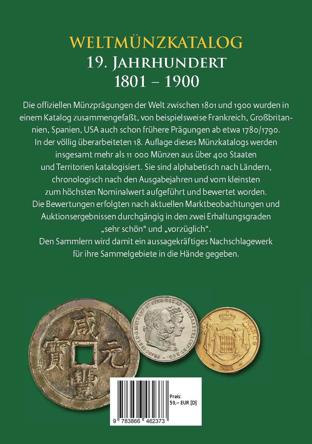 Der Weltmünzkatalog 19. Jahrhundert gilt nicht nur deshalb als Standardwerk, weil er der einzige deutschsprachige Katalog für diese Epoche ist. Vielmehr hat er sich über viele Jahre hinweg und in bereits 17 erfolgreichen Auflagenauf dem Markt und in der Sammlerschaft etabliert.Begründet wurde dieser Katalog von Günter Schön ( 2012), der dieses Werk bis zur 15. Auflage betreute. Mit dem derzeitigen Bearbeiter Helmut Kahnt, einem bekannten Numismatiker, erscheint der Weltmünzkatalog 19. Jahrhundert nun zum dritten Mal in neuem Format - komplett überarbeitet und auf den neuesten Stand gebracht.Alle offiziellen Münzprägungen der Welt von 1801 bis 1900 - über 11 000 Münzen aus über 400 Ländern - sind in diesem Standardwerk versammelt. Viele Münzen sind mit Vorder- und Rückseite abgebildet und beschrieben.Die Bewertungen in zwei Erhaltungsgraden erfolgten auf der Grundlage von aktuellen Auktionsergebnissen und konsolidierten Marktbeobachtungen.