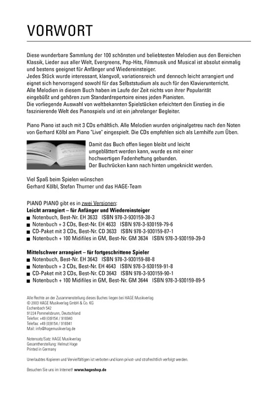 Gerhard Kölbl, geboren 1959, ist studierter Pianist und arbeitet als Klavierpädagoge, Arrangeur und Studiomusiker. Nach seiner Klavierausbildung arbeitete er als professioneller Musiker und studierte Musikwissenschaft in München. Seit 1992 gibt er Unterricht. Seit 2003 ist er für den HAGE Musikverlag als Autor und Arrangeur tätig. Als erfolgreicher Bestseller-Autor der PIANO PIANO Reihe und anderer erfolgreicher Klaviertitel hat er mittlerweile unzählige Klavierspieler begeistert und inspiriert.